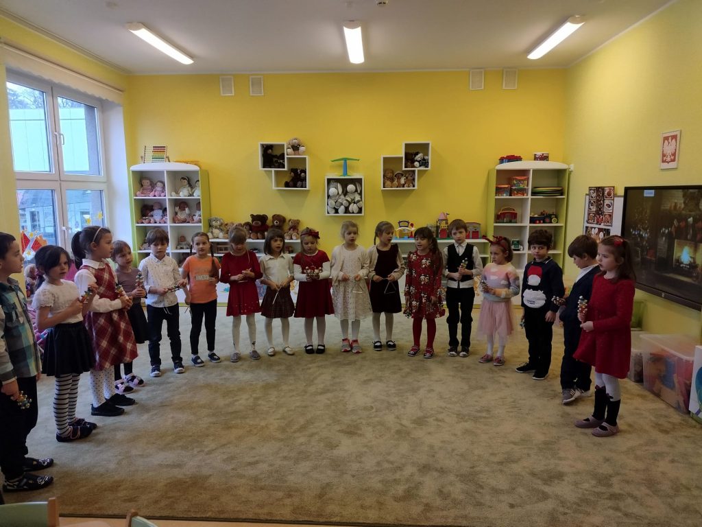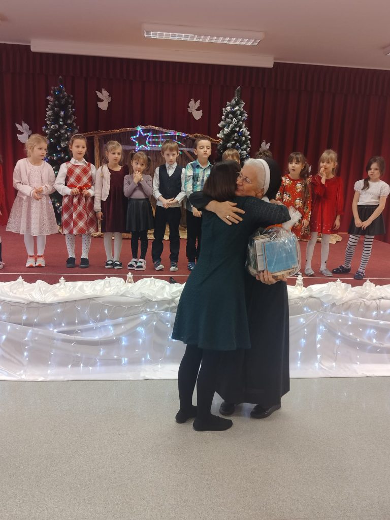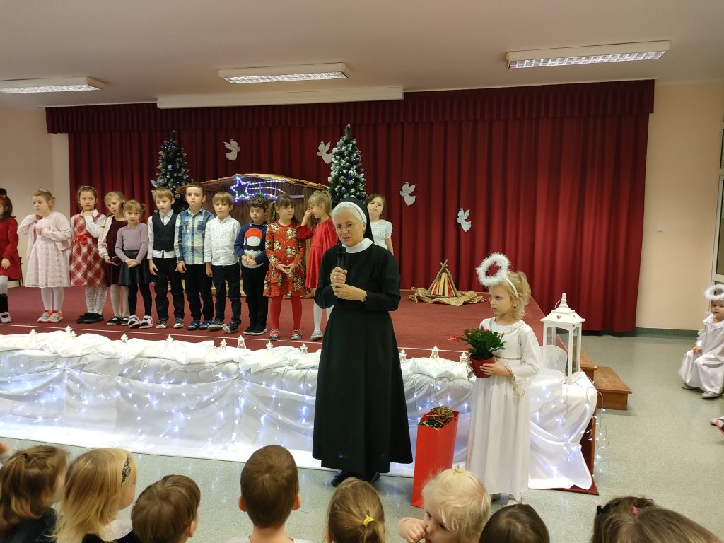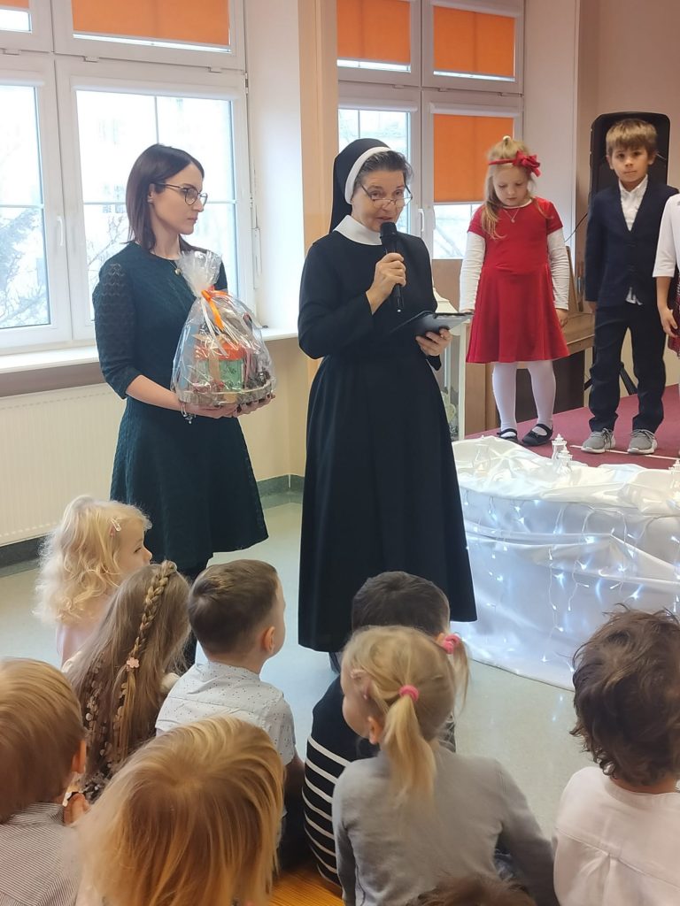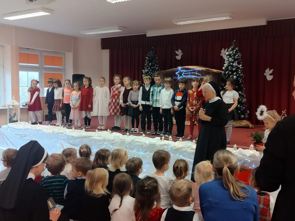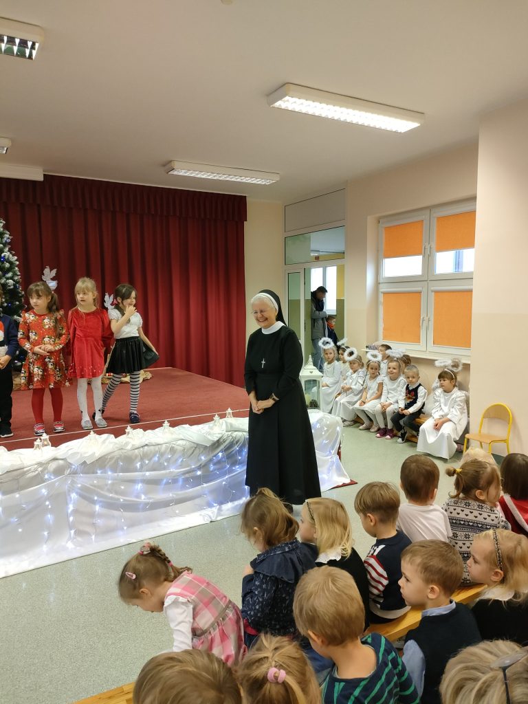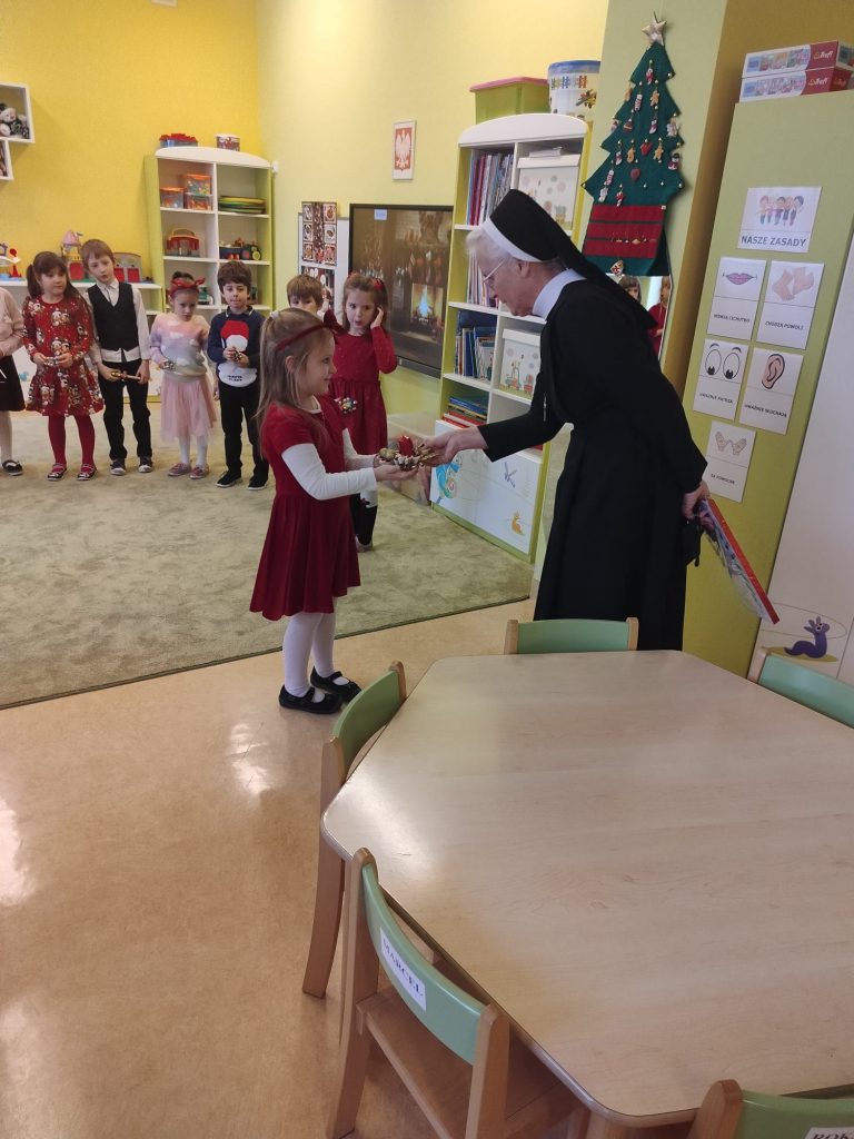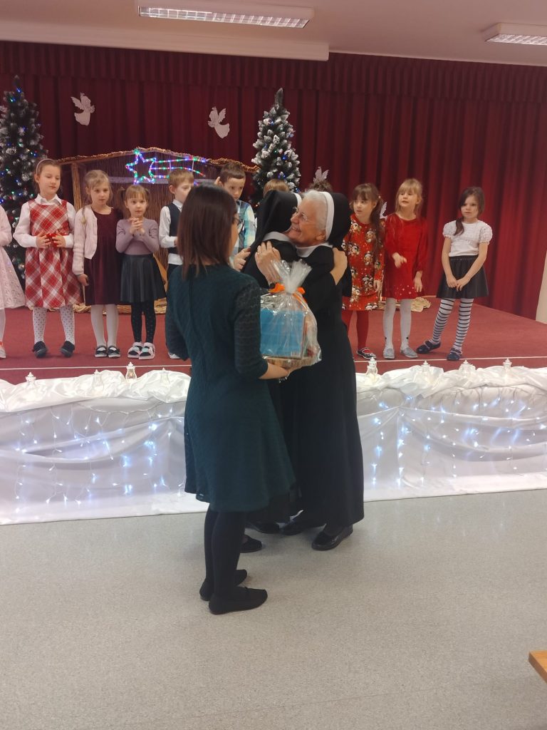 W ramach przygotowania do Świąt Bożego Narodzenia grupa lawendowa przygotowała krótkie życzenia przeplatane kolędami. Była to również okazja do podziękowania p. Małgosi z kuchni, która po 23 latach pracy w naszym przedszkolu odchodzi na zasłużoną emeryturę. Podziękowania w imieniu całego przedszkola złożyli zerówkowicze oraz s. Dyrektor. Na sam koniec spotkania Nauczyciele złożyli świąteczne życzenia s. Marii i zaśpiewaliśmy wspólnie kolęde. Wszystkim pracownikom, dzieciom i rodzinom naszego przedszkola życzymy Błogosławionych Świąt Narodzenia Pańskiego.