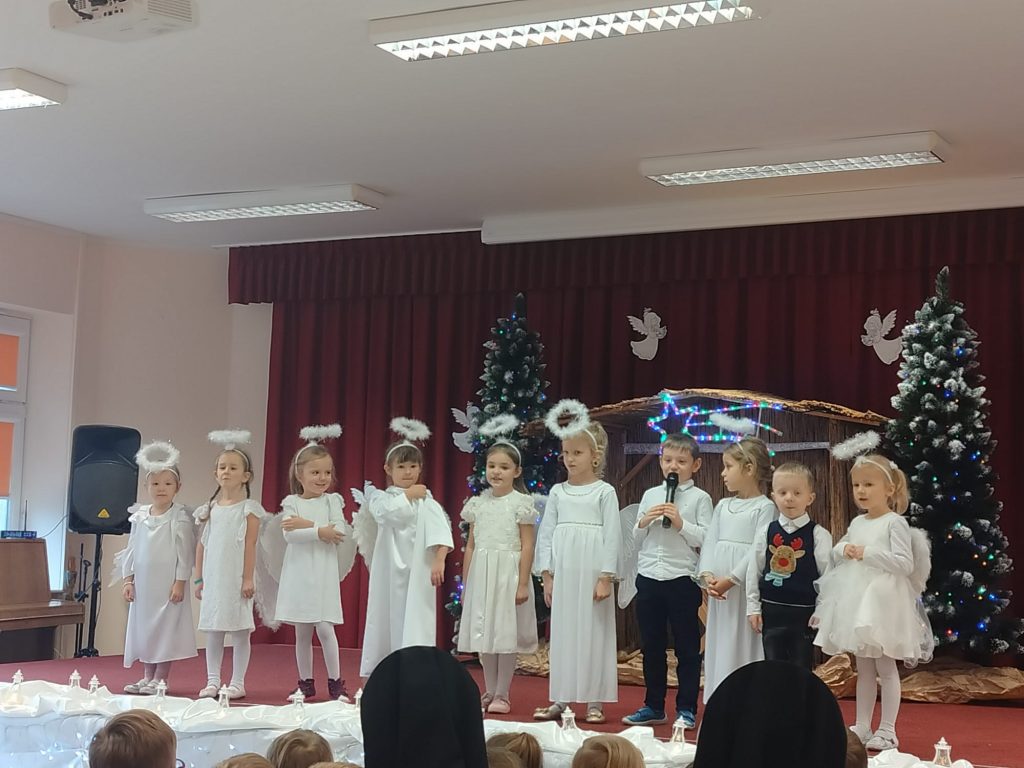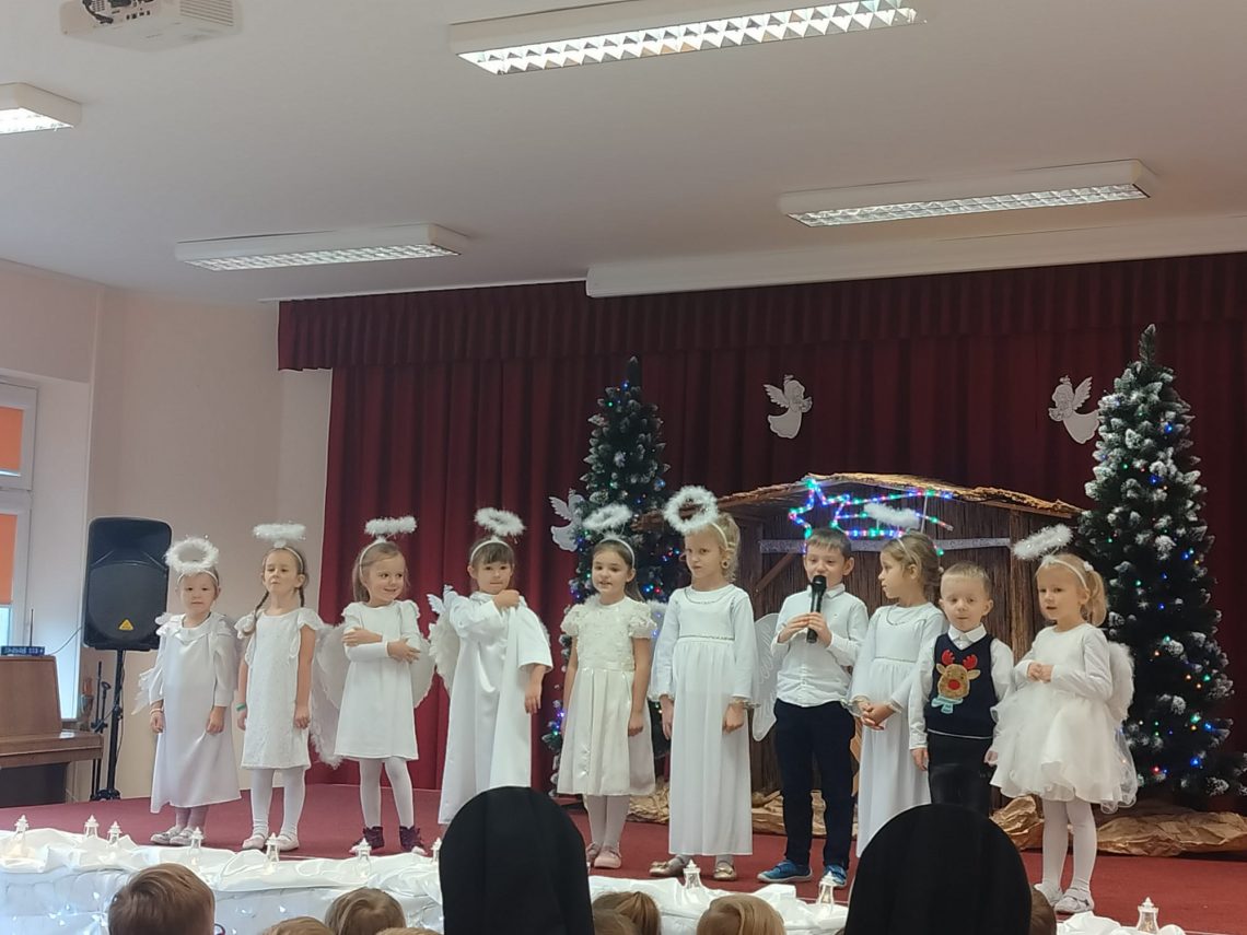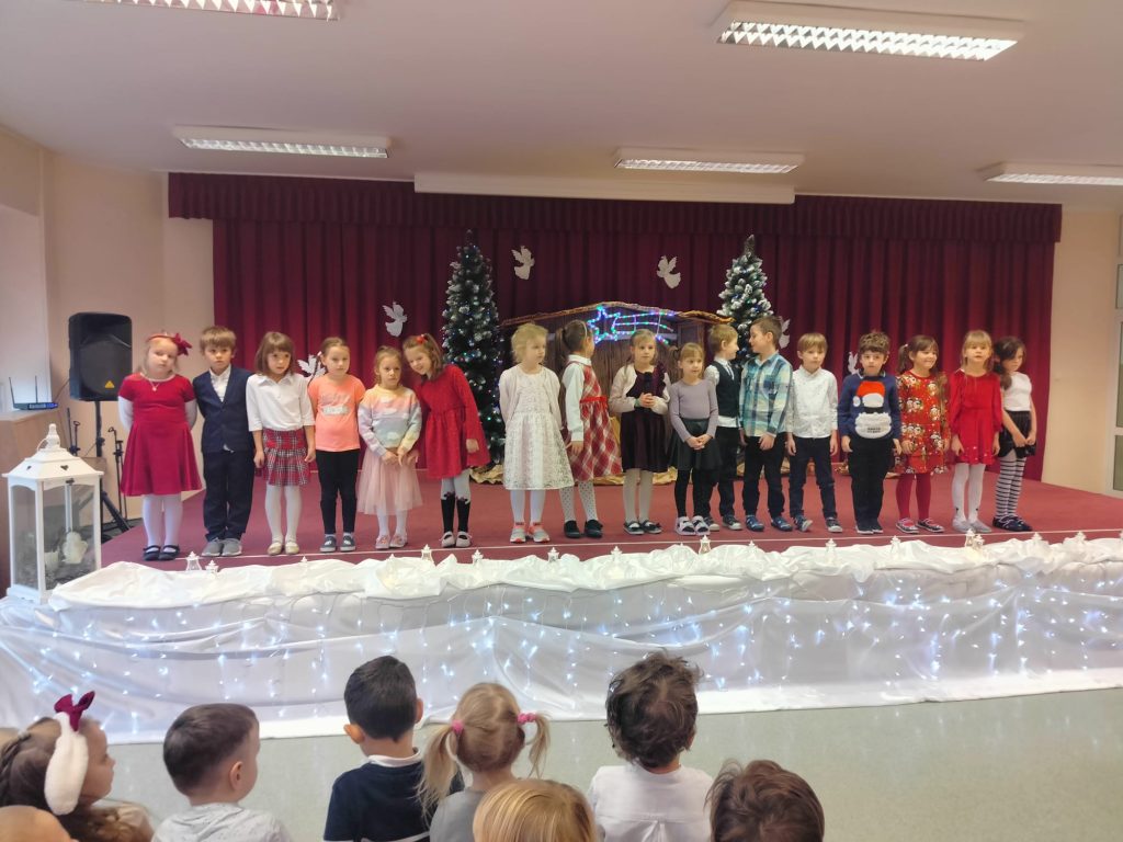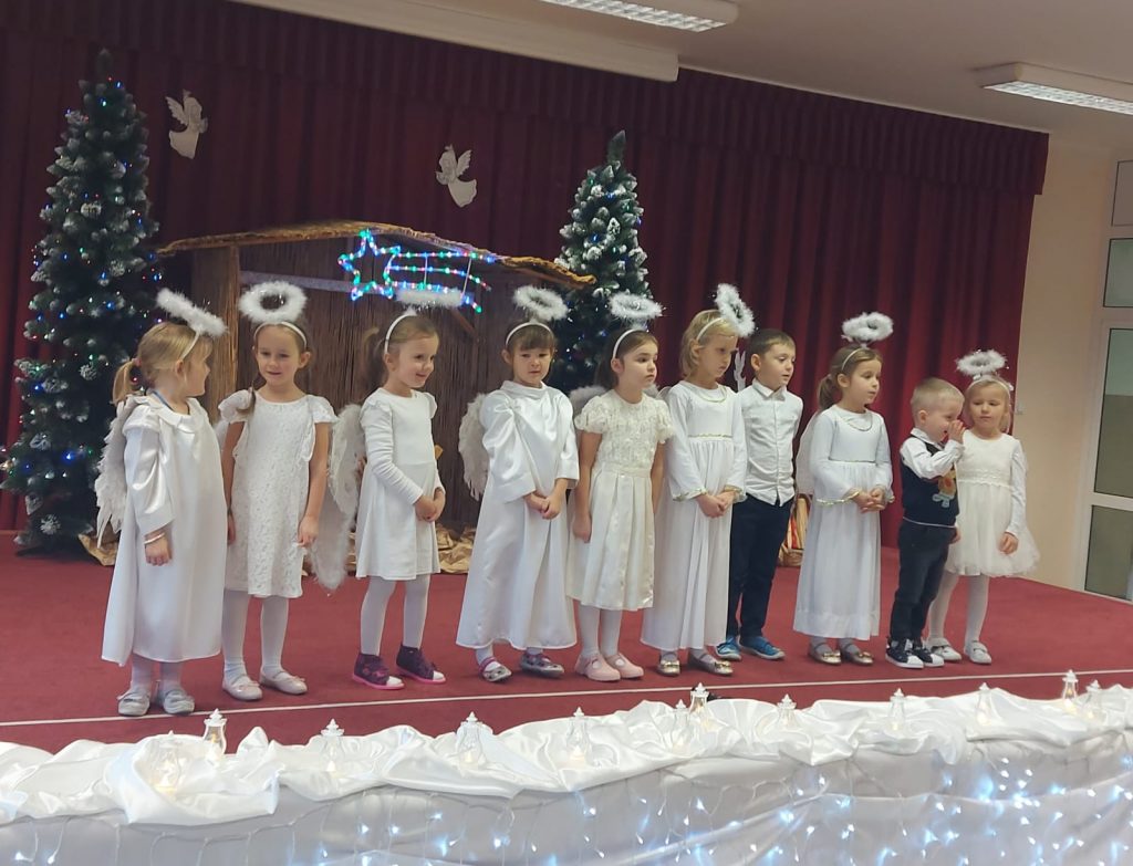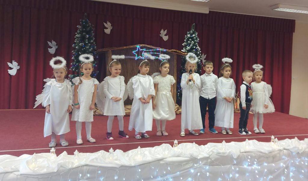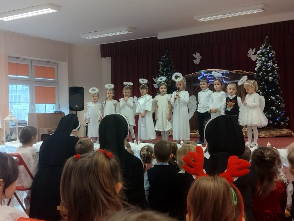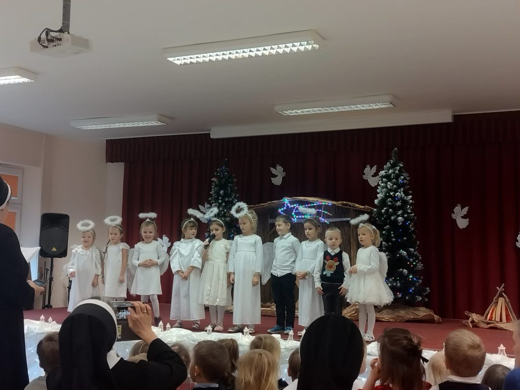 W ramach przygotowania do Świąt Bożego Narodzenia grupa lawendowa przygotowała krótkie życzenia przeplatane kolędami. Była to również okazja do podziękowania p. Małgosi z kuchni, która po 23 latach pracy w naszym przedszkolu odchodzi na zasłużoną emeryturę. Podziękowania w imieniu całego przedszkola złożyli zerówkowicze oraz s. Dyrektor. Na sam koniec spotkania Nauczyciele złożyli świąteczne życzenia s. Marii i zaśpiewaliśmy wspólnie kolęde. Wszystkim pracownikom, dzieciom i rodzinom naszego przedszkola życzymy Błogosławionych Świąt Narodzenia Pańskiego.