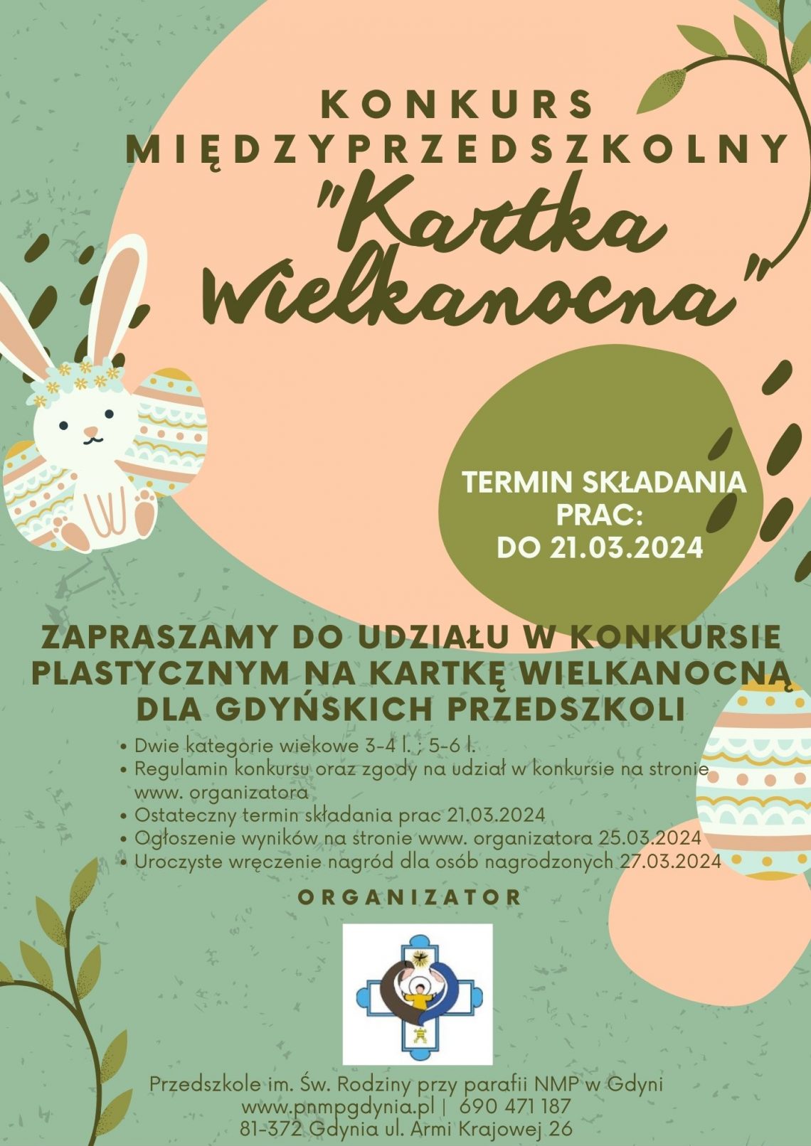 Zachęcamy wszystkie dzieci, uczęszczające do przedszkoli na terenie miasta Gdynia do udziału w Międzyprzedszkolnym Konkursie Plastycznym na Kartkę Wielkanocną. Konkurs składa się z dwóch etapów:
