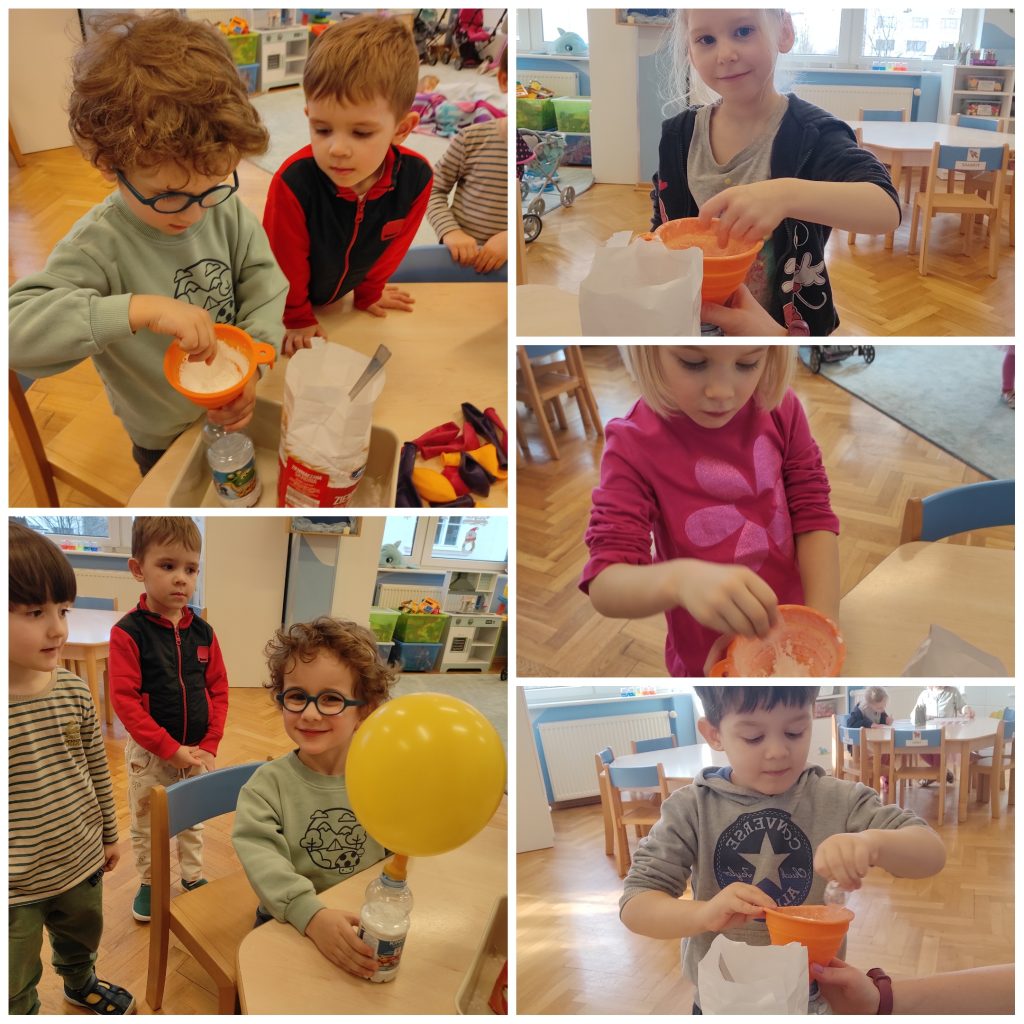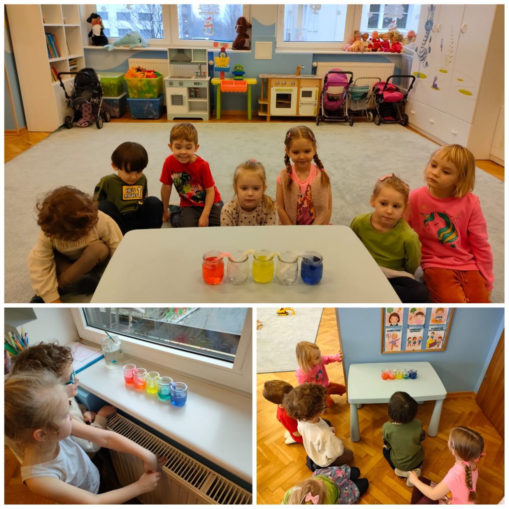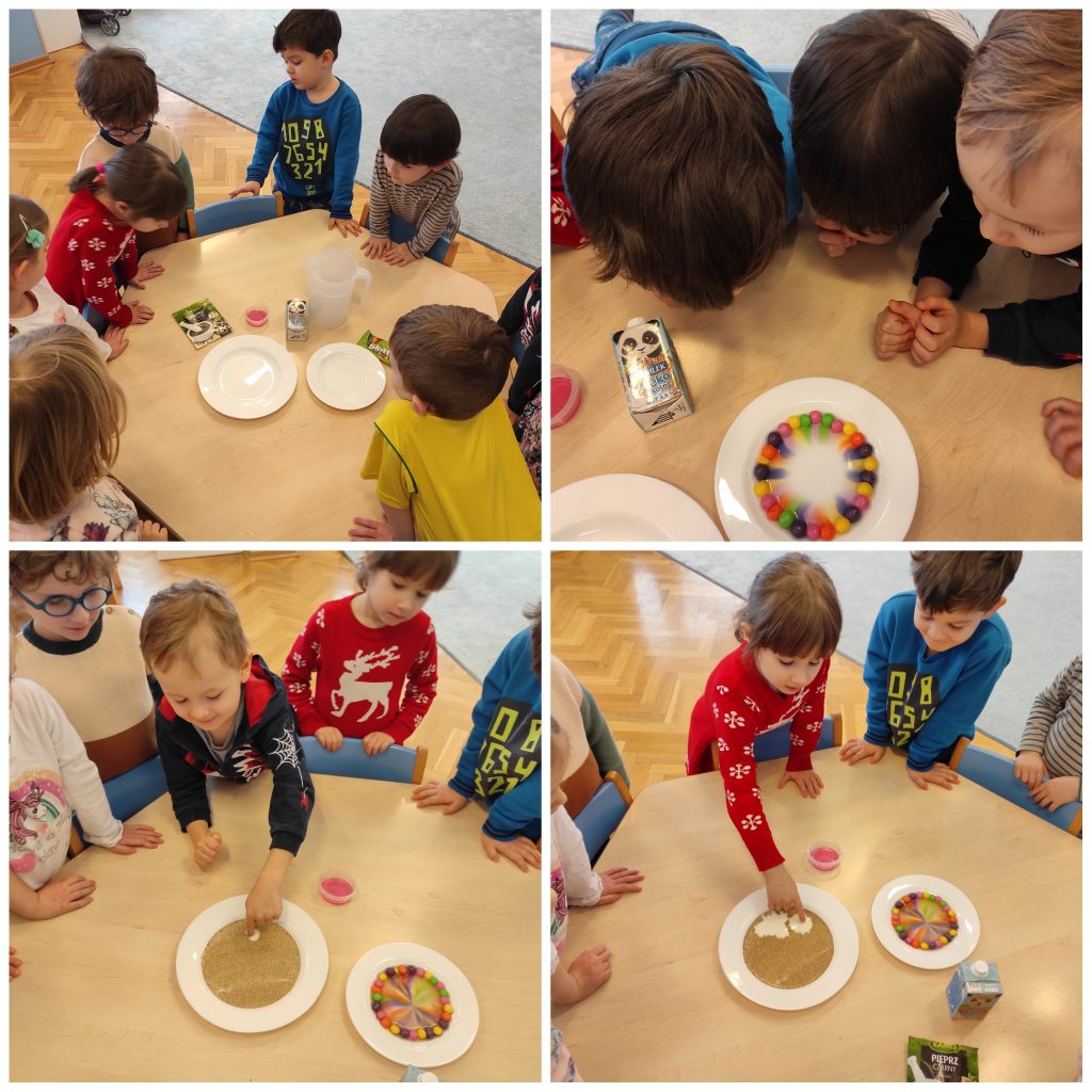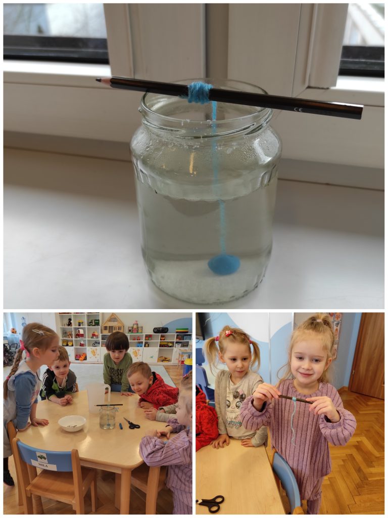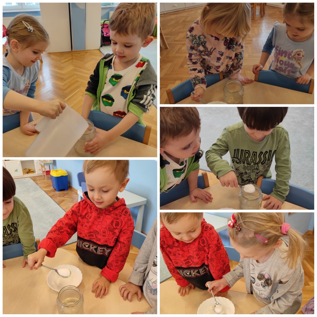 Drugi tydzień ferii dzieci z grupy niebieskiej wykorzystały na realizację projektu „Mali Odkrywcy”. Dzieci poznały definicję „roztworu nasyconego” i miały możliwość wykonać solne kryształy. Przy pomocy wody i bibuły odkryły w jaki sposób mieszają się barwy i powstają nowe kolory. Dzieci miały też możliwość wykonać gniotka sensorycznego ( och było w sali biało). ;)Kolejnego dnia próbowaliśmy zaobserwować zjawiska, które tworzą się z barwników spożywczych, które mamy w cukierkach oraz udowodniliśmy, że mydło bardzo szybko odgania brud. To był bardzo intensywny tydzień.