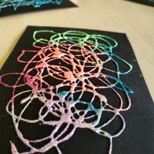 W Kosmosie znajdują się piękne, kolorowe obłoczki zwane mgławicami. Dzieci za pomocą kleju tworzyły na czarnym papierze szlaczki i posypywały je brokatem w różnych kolorach. Nasze przedszkolne mgławice prezentują się wspaniale.