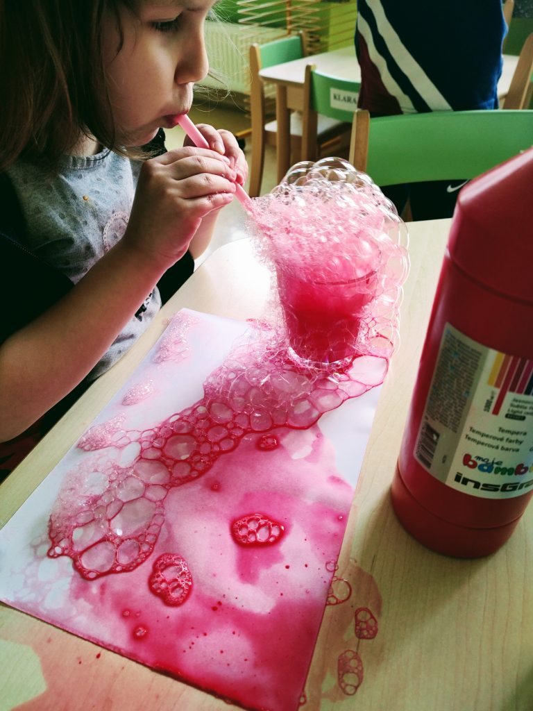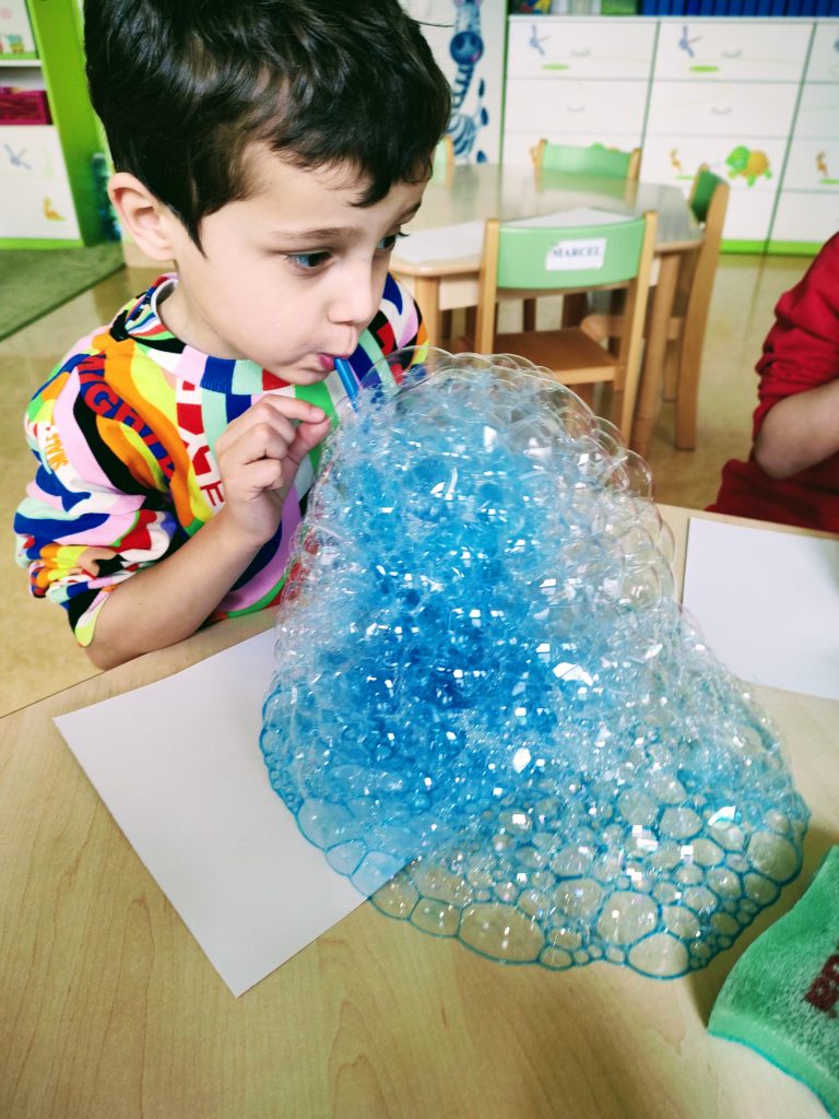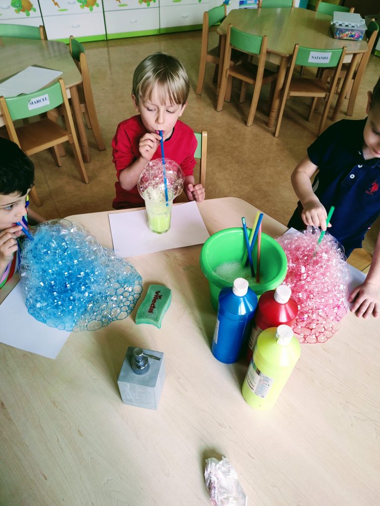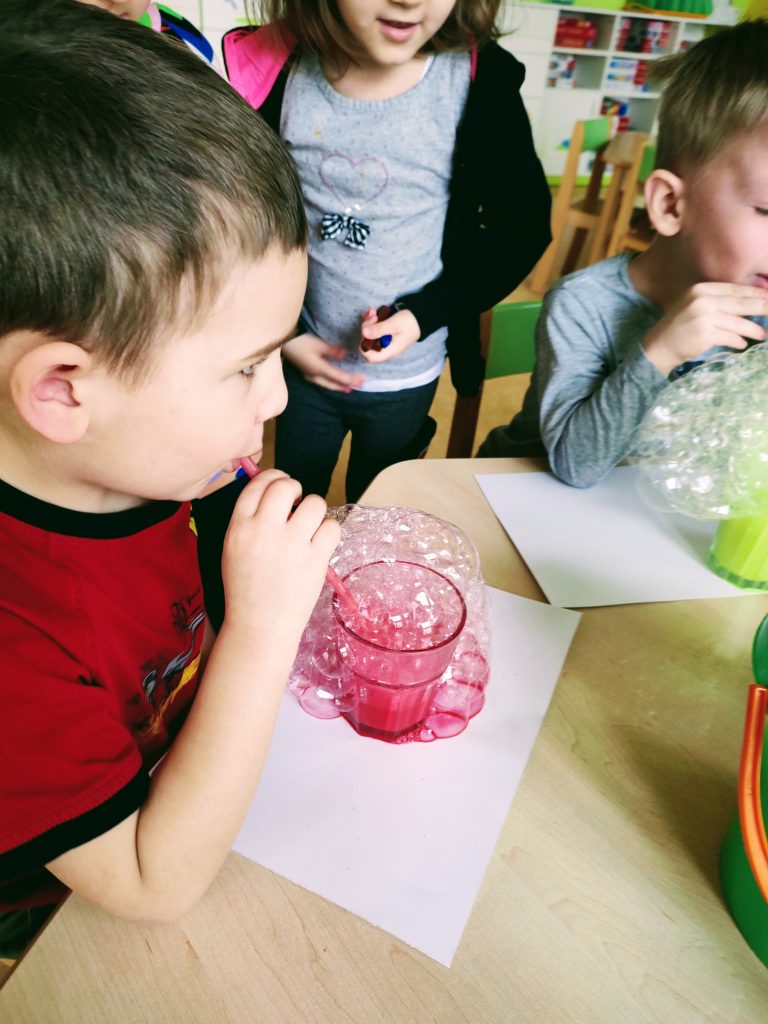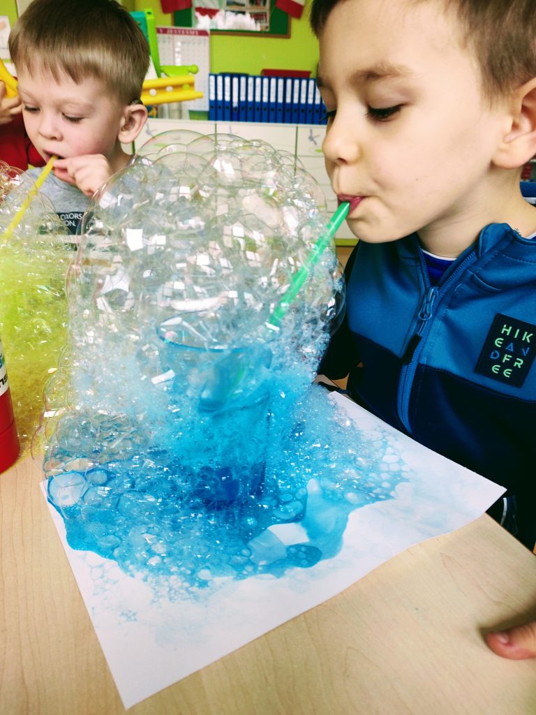 AKTUALNOŚCI, GRUPA ZIELONA Kolorowe bańki 28/02/2024 / Dzisiaj w naszej grupie przeprowadziliśmy kolorowy eksperyment. Zabarwiliśmy wodę farbą, wlaliśmy do niej płyn do mycia naczyń, włożyliśmy do kubka z wodą słomkę i moooocno dmuchaliśmy. Powstała nam piękna, kolorowa piana! 😉