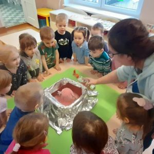 Podczas zajęć o dinozaurach obejrzeliśmy krótki film następnie dzieci wzięły udział w zabawie badawczej- jak wybucha wulkan, a na koniec zrobiliśmy pracę plastyczną- Dinozaury i wybuch wulkanu.