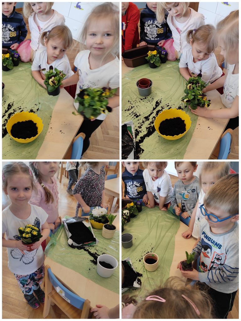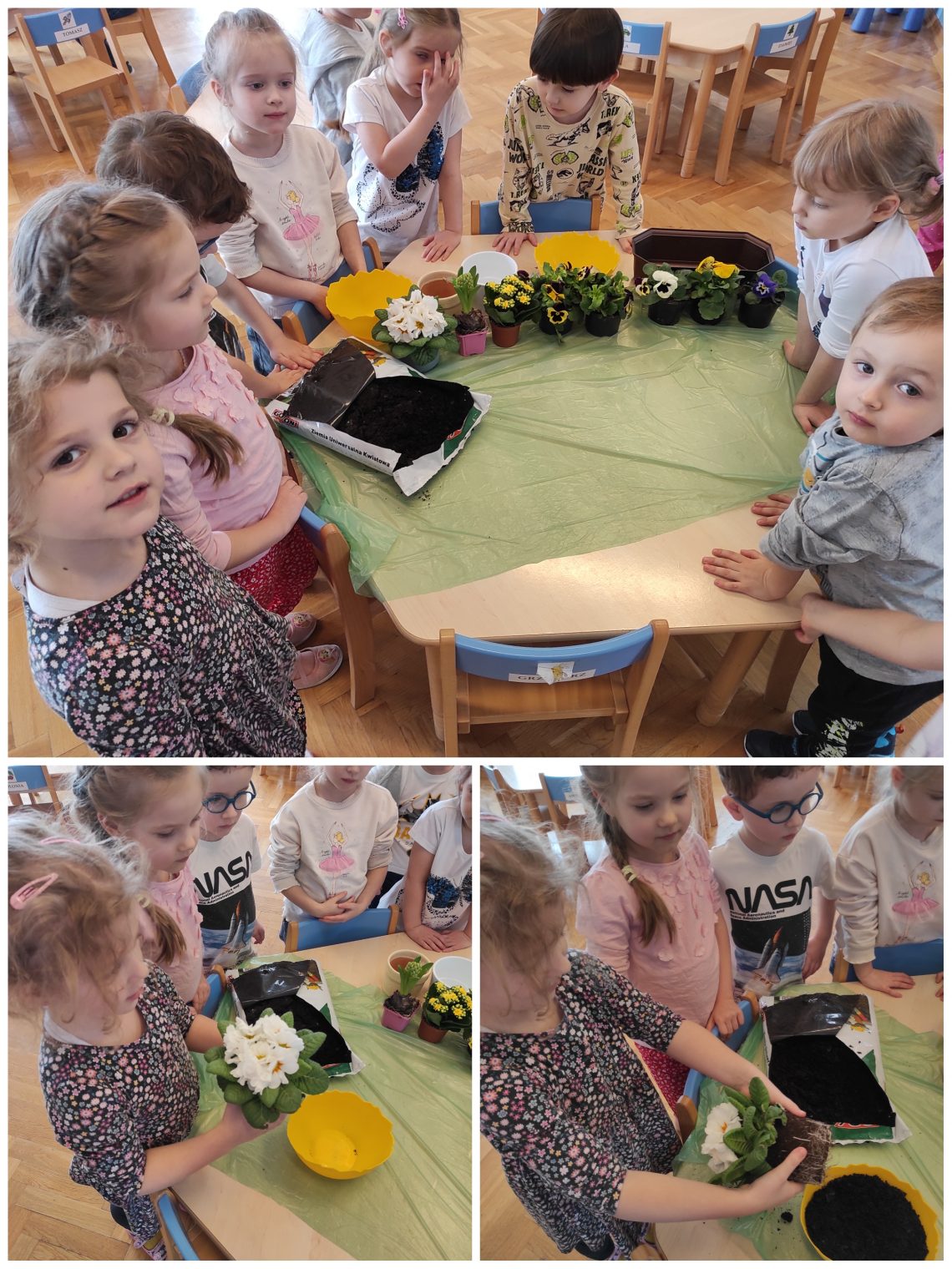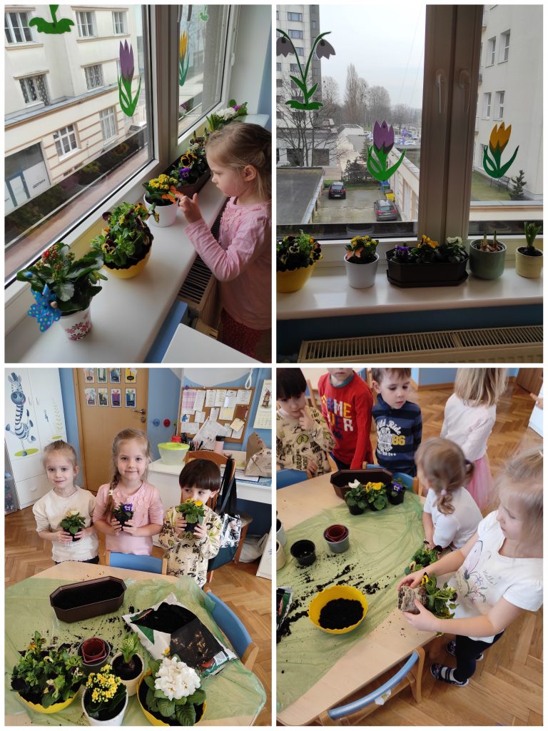 W sali niebieskiej przywołujemy wiosnę tworząc nasz wiosenny kącik przyrodniczy. Podczas zajęć mieliśmy okazję porozmawiać o tym czego rośliny potrzebują, aby mogły zdrowo rosnąć. Dzieci dzielnie pomagały w sadzeniu kwiatów, ale też bardzo dokładnie przyglądały się ich korzeniom, które się znacząco od siebie różniły. Od teraz musimy o nie dbać – wkraczamy w nowe obowiązki.