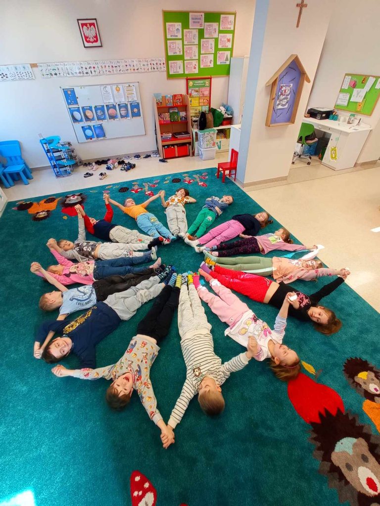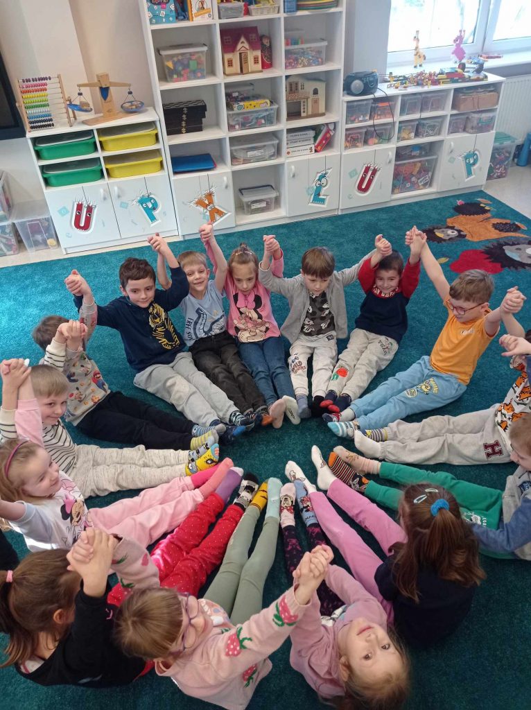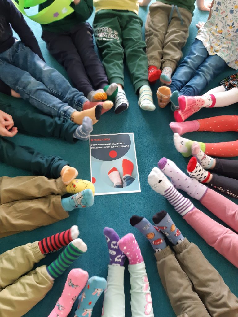 Dzieci z grupy: Lawendowej, Turkusowej, Czerwonej, Pomarańczowej wraz z wychowawcami wzięły udział w ogólnopolskim projekcie edukacyjno-społecznym „Kolorowe skarpetki nie do pary”. Dzisiejszy dzień ma na celu podnoszenie świadomości wśród najmłodszych dotyczącej zespołu Downa i promowanie postawy ceniącej ludzką różnorodność, dzięki której świat jest piękny, kolorowy, ciekawy,