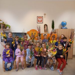 Grupa Pomarańczowa przedstawia efekt końcowy swojej popołudniowej pracy – naturalne palmy, które oczywiście zabrała do domu, by w minioną Niedzielę Palmową zabrać je do kościoła.