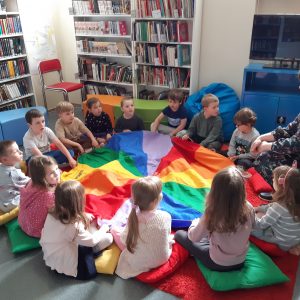 Grupa Turkusowa w związku z obchodzonym 8 maja Dniem Bibliotekarza 7 majawybrała się do Biblioteki Wzgórze w Gdyni, na zajęcia edukacyjne związane z tymdniem. Zajęcia w bibliotece rozpoczęliśmy od zabawy „ Jaki to…