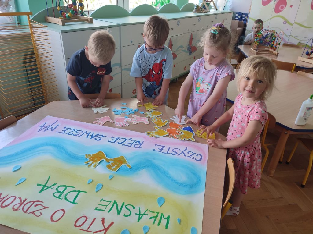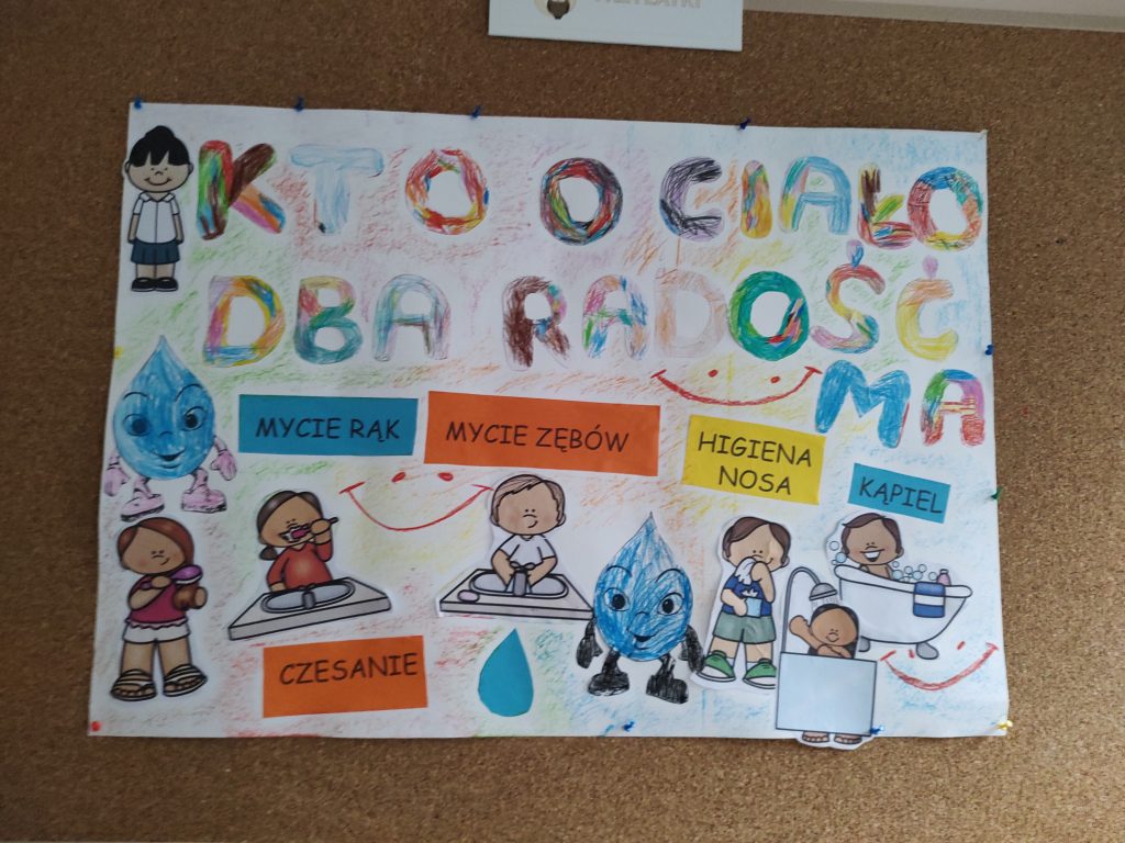 W naszym przedszkolu odbyła się akcja promująca zdrowy styl życia- każda z grup wykonała plakat według własnego pomysłu. Nauczyciele rozmawiali z dziećmi o właściwym odżywianiu, konieczności picia odpowiedniej ilości wody w ciągu dnia, przestrzeganiu zasad higieny oraz regularnej aktywności fizycznej, która pozwala zachować ciało w zdrowiu. W zdrowym ciele zdrowy duch!