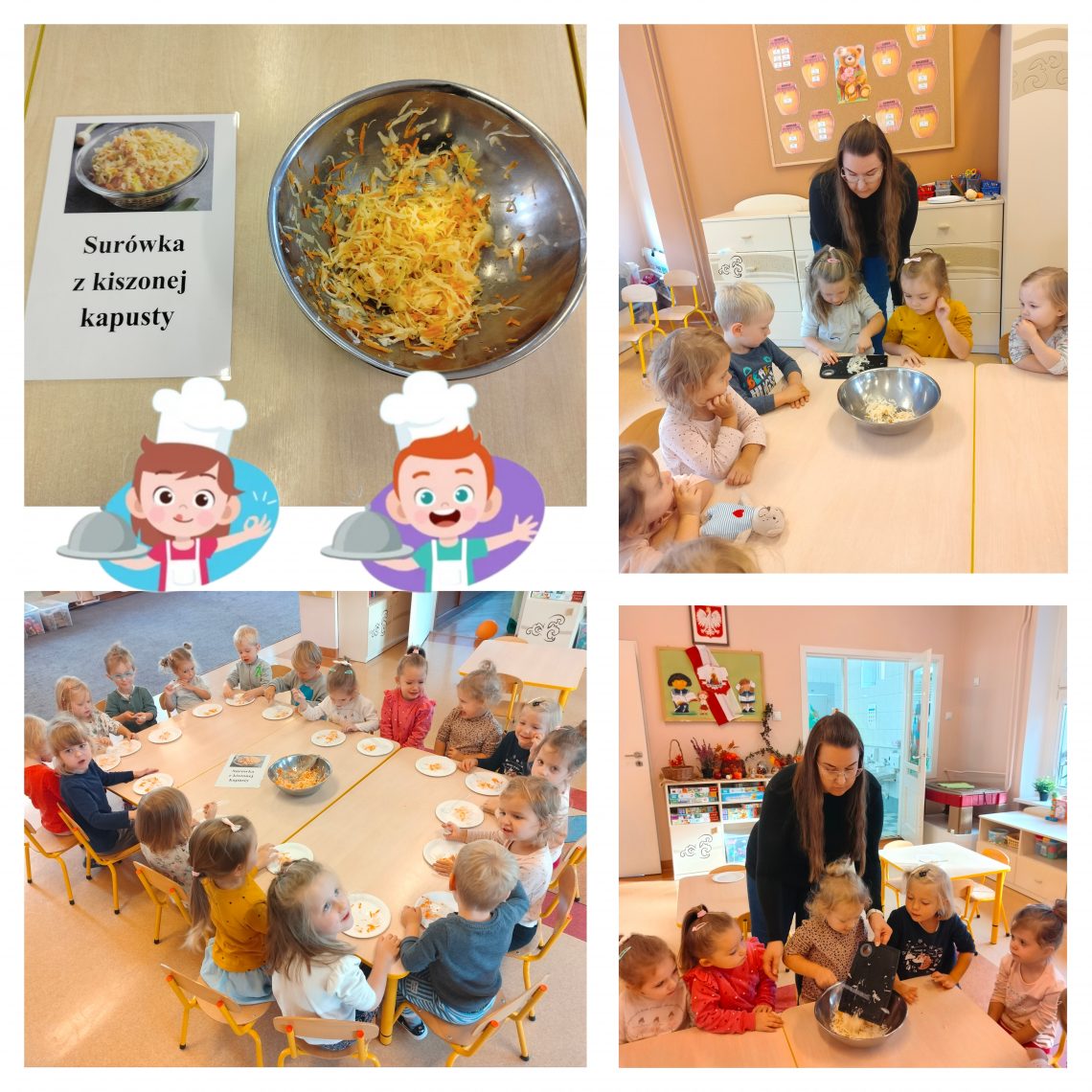 Przedszkolaki z naszej grupy miały okazję przygotować samodzielnie pod czujnym okiem Pani Irenki i Mariolki surówkę z kiszonej kapusty z marchewką i jabłuszkiem. Dzieci z radością i zaangażowaniem podjęły zadanie. Na koniec zajęć czekała ich pyszna degustacja.