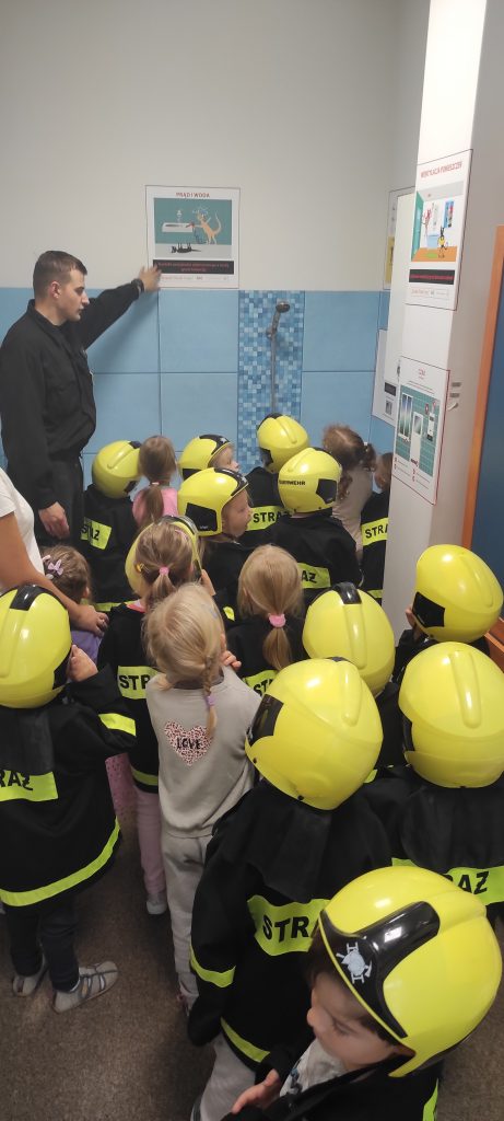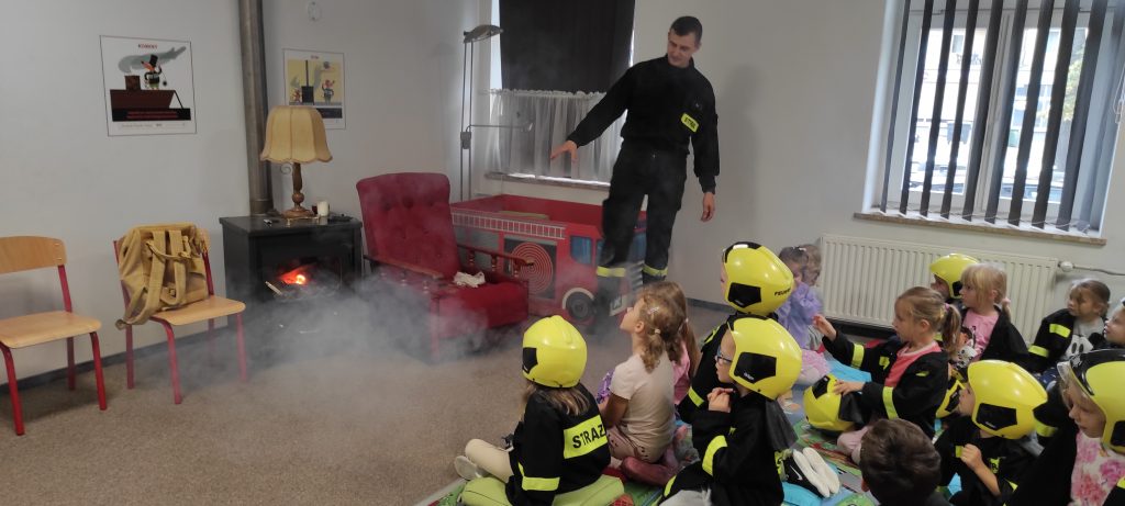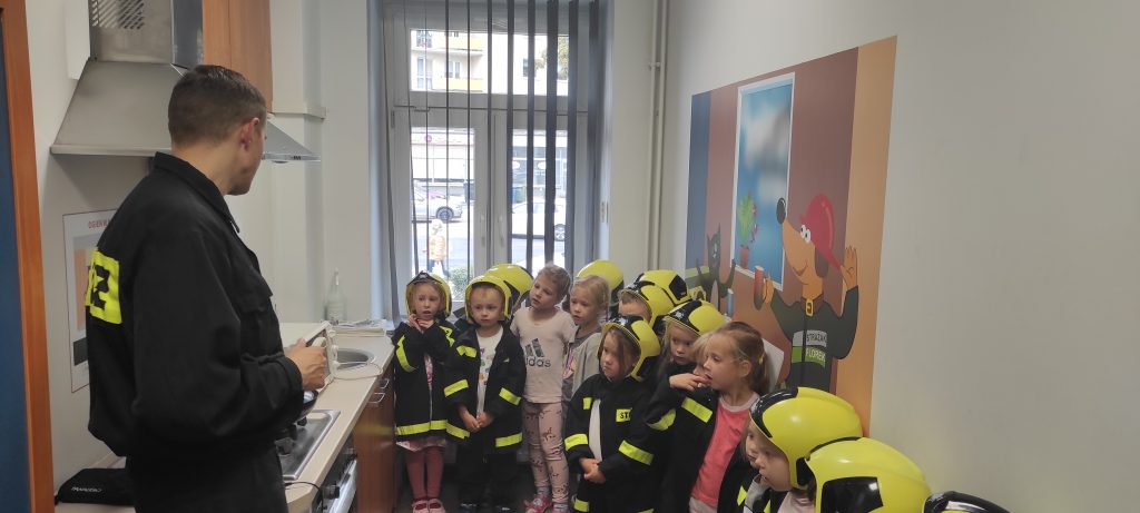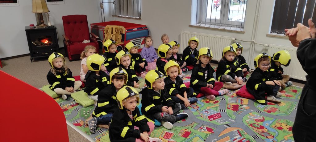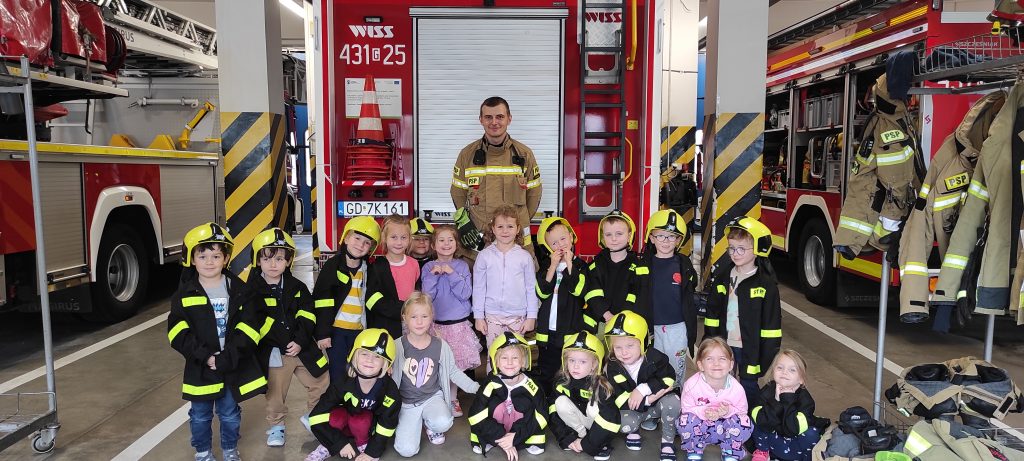 9 października mieliśmy okazję uczestniczyć w zajęciach edukacyjnych w sali „Ognik”, która mieści się w Państwowej Straży Pożarnej w Gdyni. Nasze zajęcia prowadził bardzo miły Pan Strażak, który opowiadał nam nie tylko o swoim zawodzie, ale również o zagrożeniach, które mogą nas spotkać w codziennym życiu. Mieliśmy możliwość zamienić się w strażaków, dzięki przygotowanym przez PSP strojom strażackim. Zwiedzaliśmy budynek straży oraz nasze ulubione miejsce – garaż ! Te ogromne maszyny zrobiły na dzieciach największe wrażenie. Jeszcze raz dziękujemy za tak cenną lekcję.