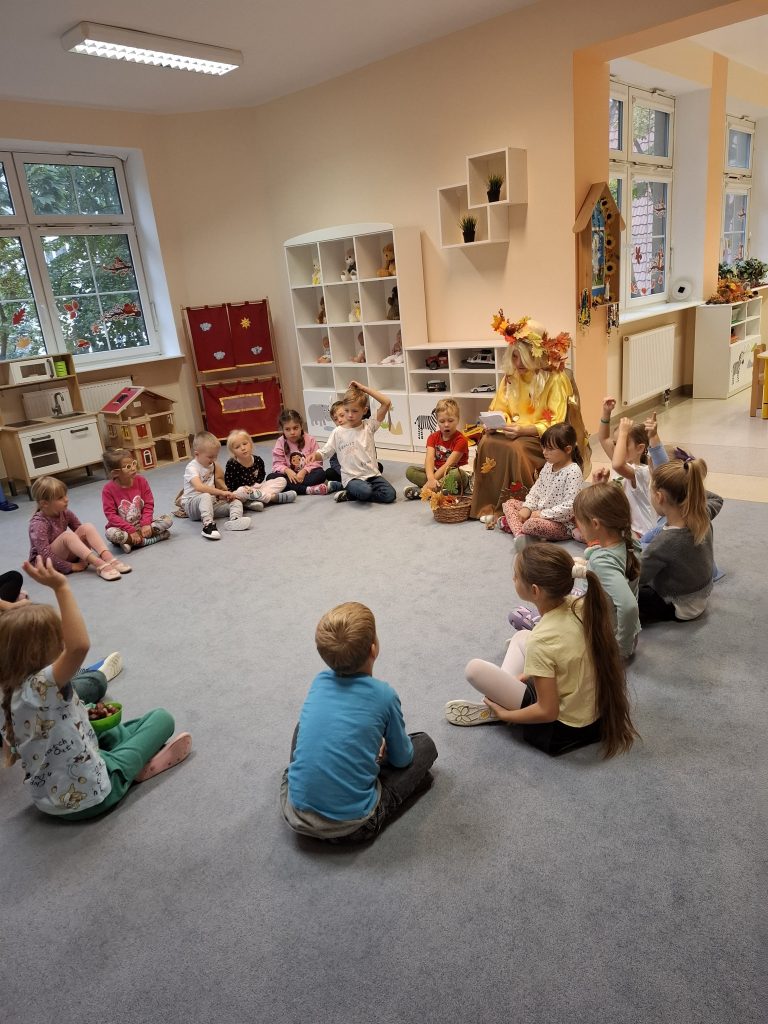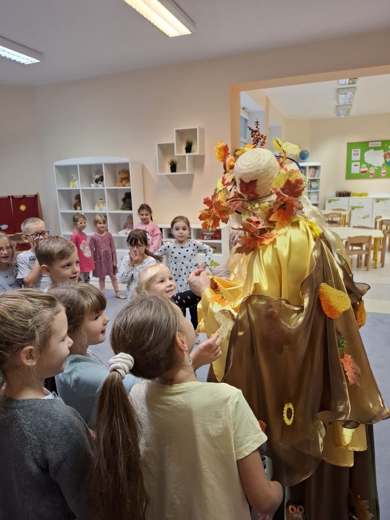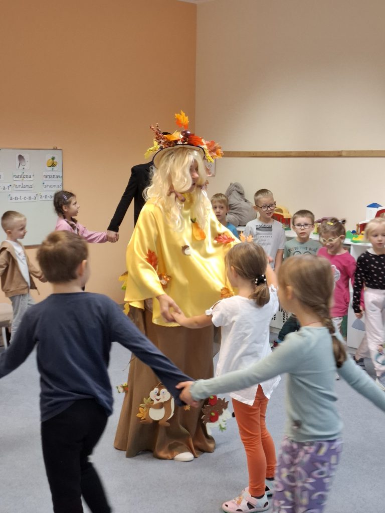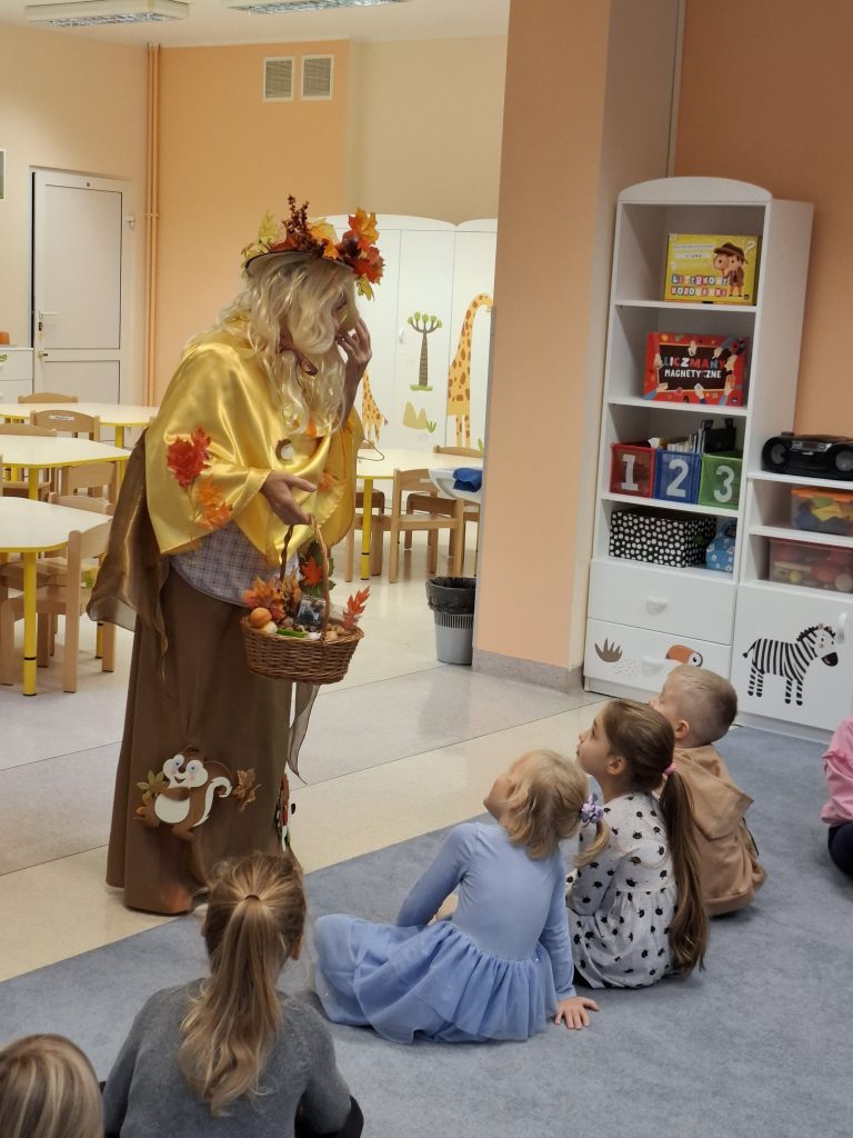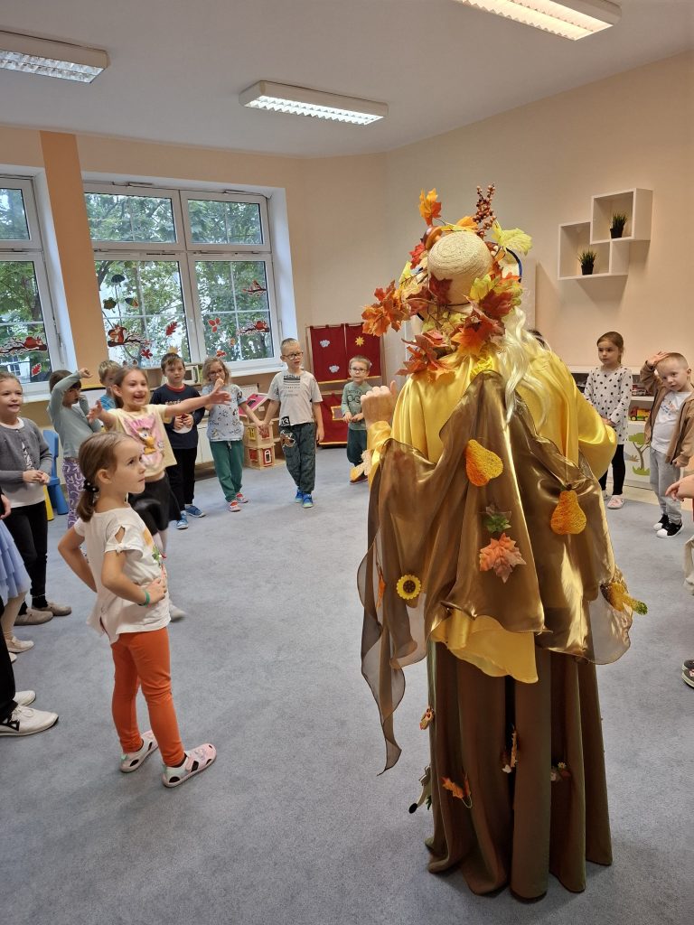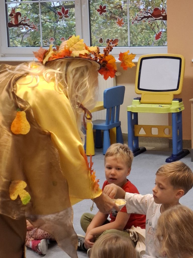 AKTUALNOŚCI, GRUPA POMARAŃCZOWA Odwiedziny Pani Jesieni 21/10/2024 / Naszą grupę dowiedziała Pani Jesień z koszem pełnych darów. Były tańce, piosenki, a także smakowanie jesiennych jabłuszek. Jesień to piękna i pełna barw pora roku.