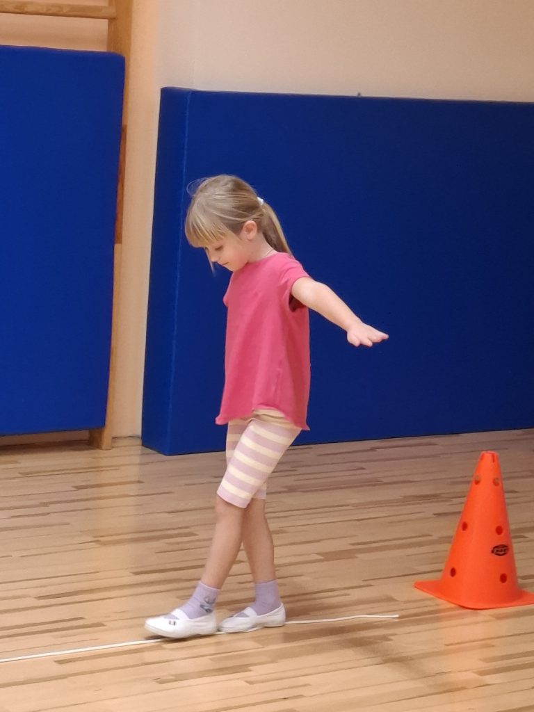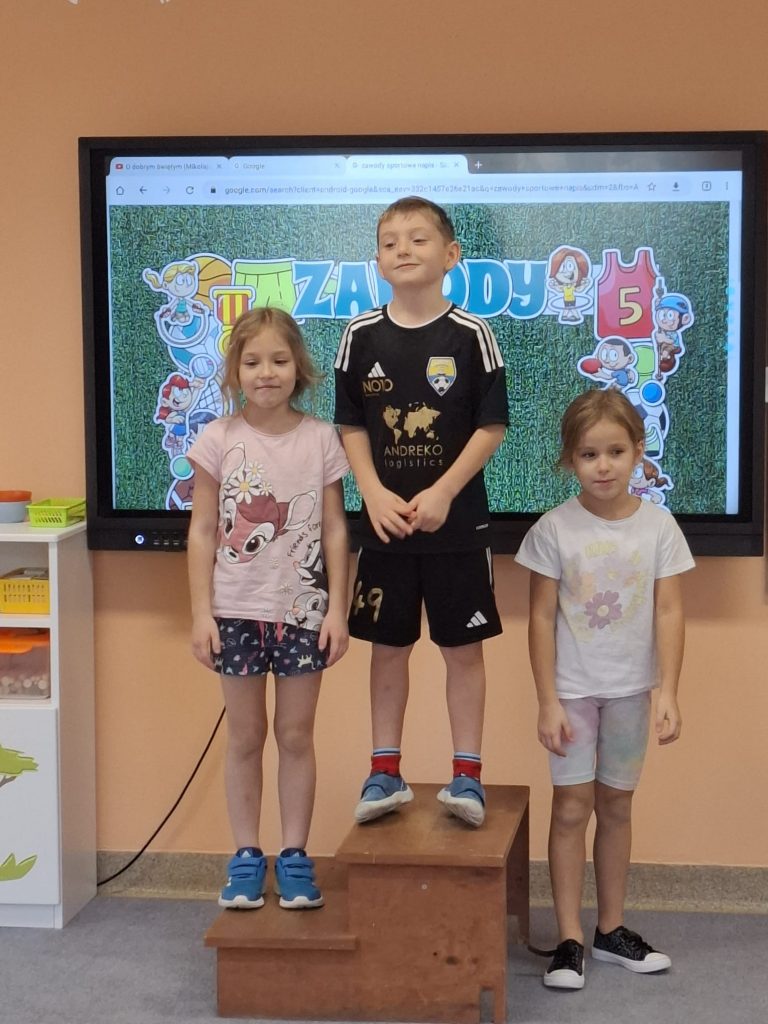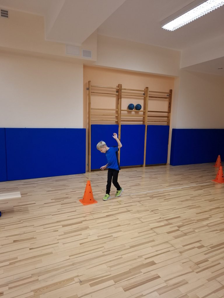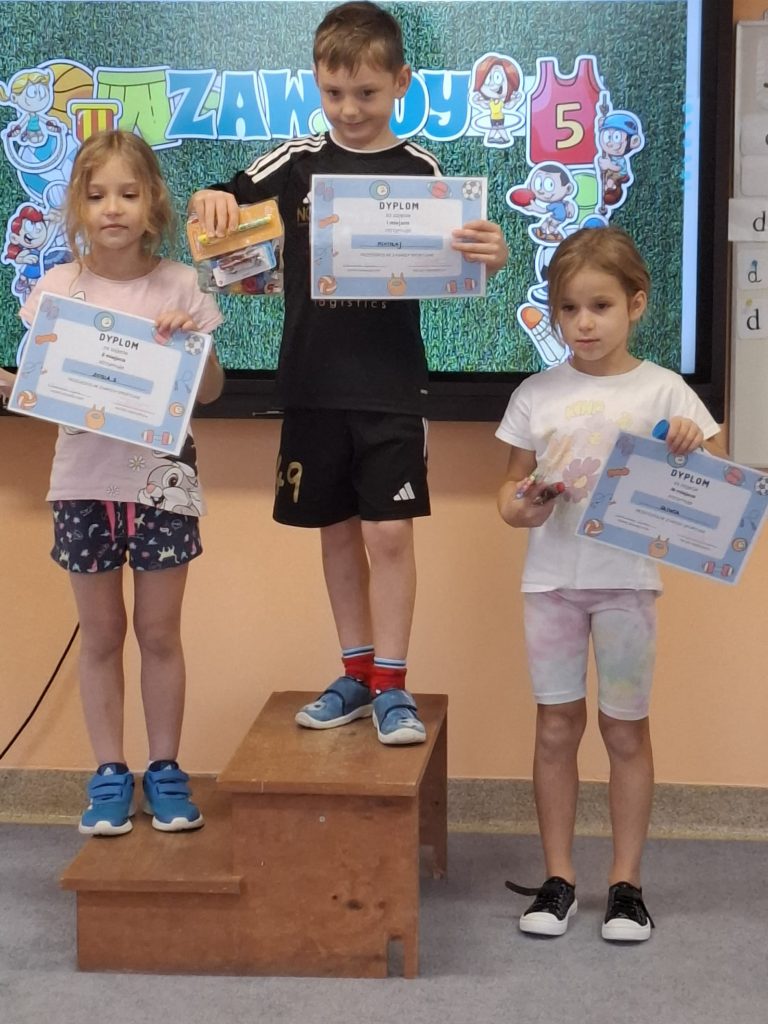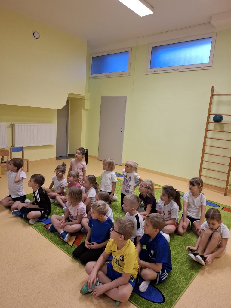 Wiemy, że sport to zdrowie dlatego z chęcią wzięliśmy udział w zawodach sportowych. Mieliśmy do pokonania 6 konkurencji: rzut do celu, łapanie piłki, skoki w przysiadzie, skoki na jednej nodze, przejście po linie i po równoważni. Wszystkie zadania wykonaliśmy wzorowo, ale o wygranej decydował również czas pokonania całego toru. Zwycięzcy zostali obdarowani nagrodami, a pozostali uczestnicy otrzymali pamiątkowe dyplomy i małe upominki.