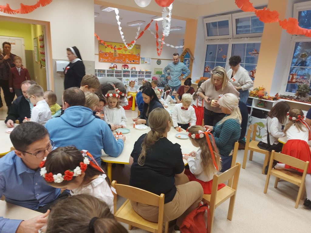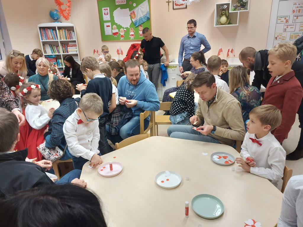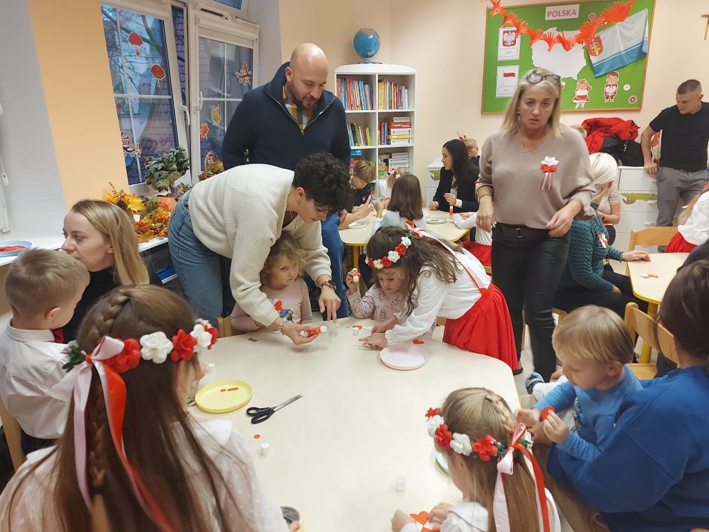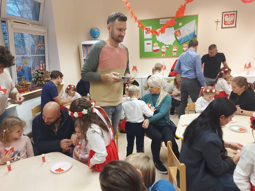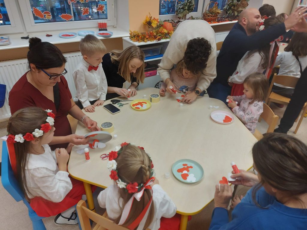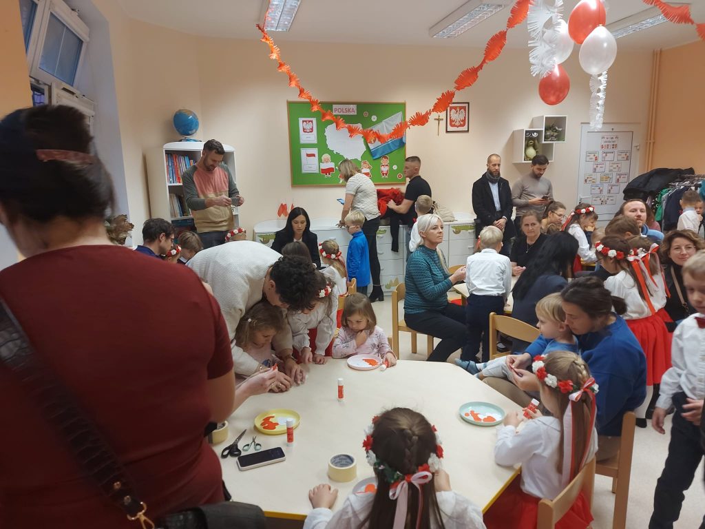 Dnia 13 Listopada w grupie pomarańczowej w ramach obchodów Święta Niepodległości odbyły się warsztaty dla dzieci oraz ich rodziców i rodzin. Na początku dzieci, ubrane w eleganckie stroje, przywitały swoich bliskich na warsztatach patriotycznych. Podczas nich rodzice przygotowali ozdobne kotyliony w barwach narodowych. Następnie wszyscy udali się na aulę, aby zobaczyć część artystyczną przygotowaną przez dzieci z naszej grupy. Podczas występu rodzice mieli okazję obejrzeć tańce i wysłuchać piosenek w wykonaniu dzieci. Całość spotkania zakończyło się wspólnym odśpiewaniem hymnu oraz zrobieniem pamiątkowych zdjęć.
