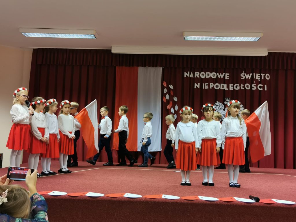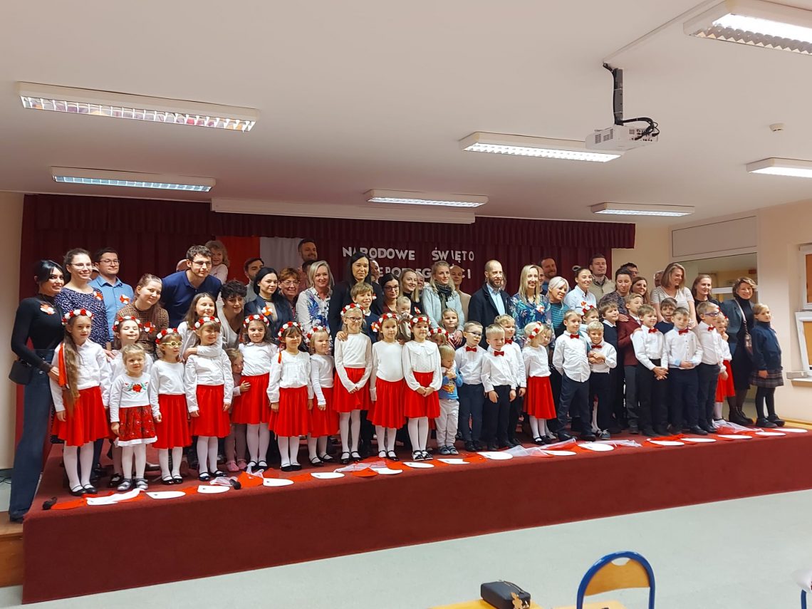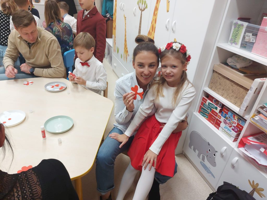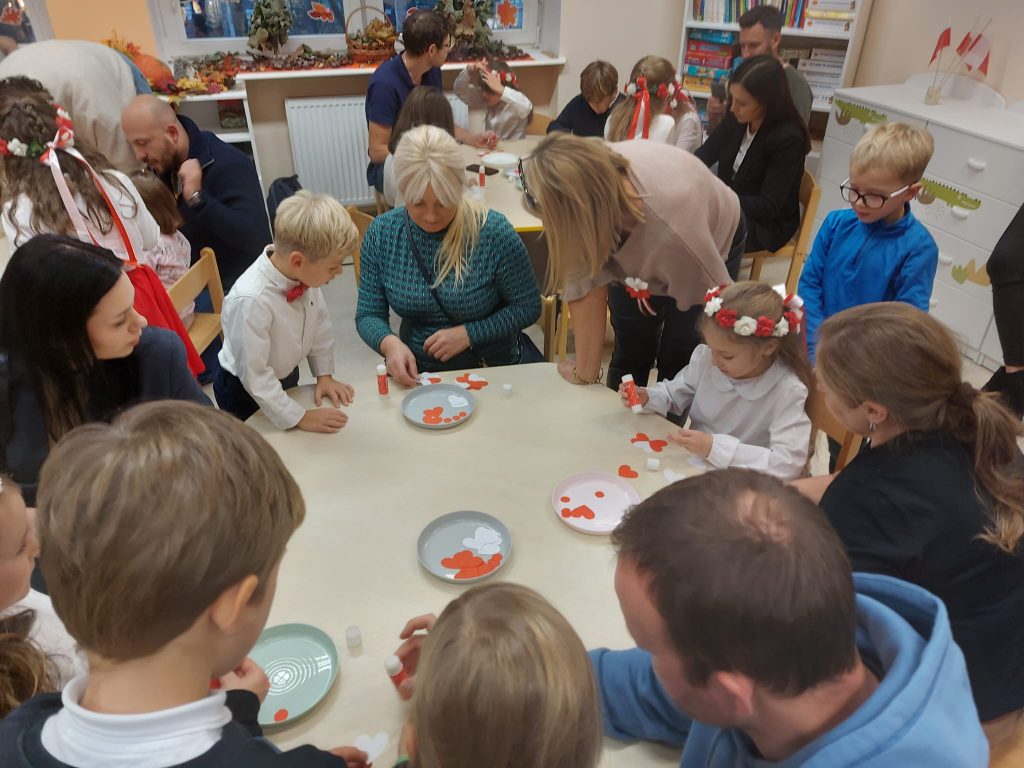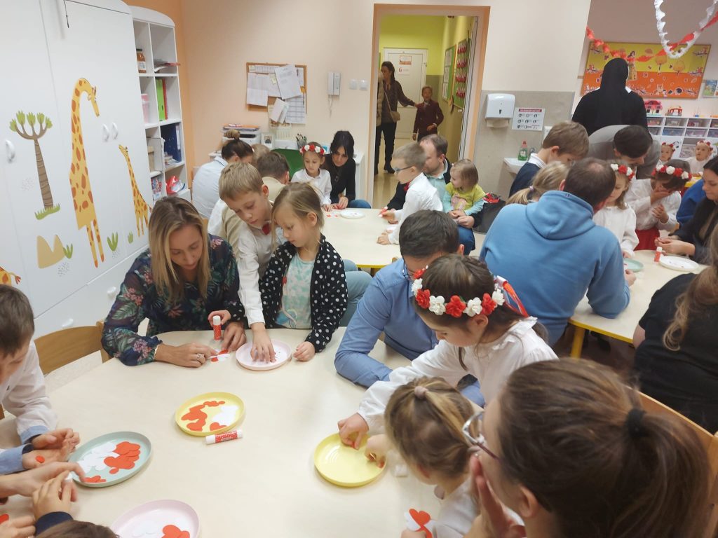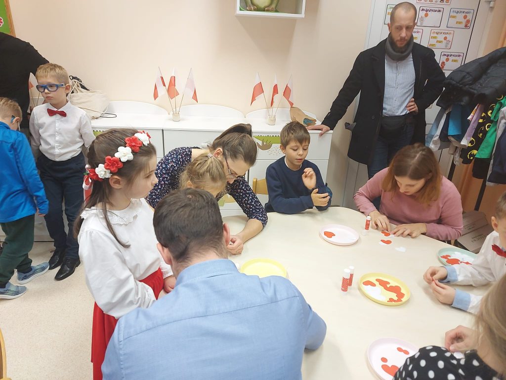 Dnia 13 Listopada w grupie pomarańczowej w ramach obchodów Święta Niepodległości odbyły się warsztaty dla dzieci oraz ich rodziców i rodzin. Na początku dzieci, ubrane w eleganckie stroje, przywitały swoich bliskich na warsztatach patriotycznych. Podczas nich rodzice przygotowali ozdobne kotyliony w barwach narodowych. Następnie wszyscy udali się na aulę, aby zobaczyć część artystyczną przygotowaną przez dzieci z naszej grupy. Podczas występu rodzice mieli okazję obejrzeć tańce i wysłuchać piosenek w wykonaniu dzieci. Całość spotkania zakończyło się wspólnym odśpiewaniem hymnu oraz zrobieniem pamiątkowych zdjęć.