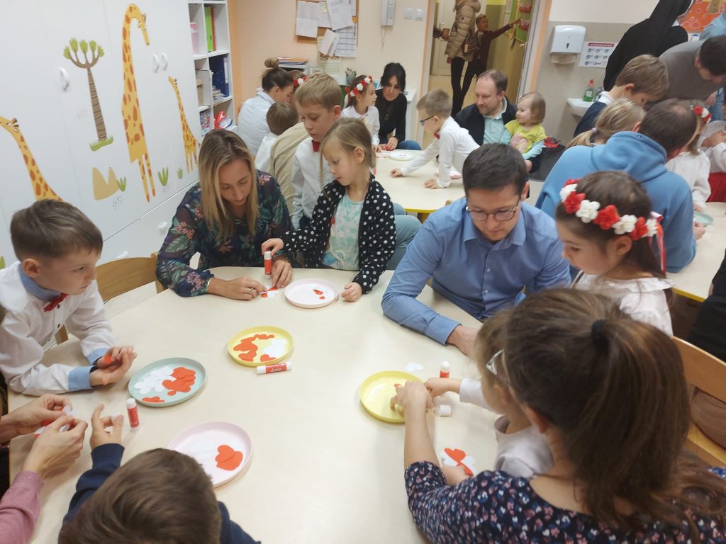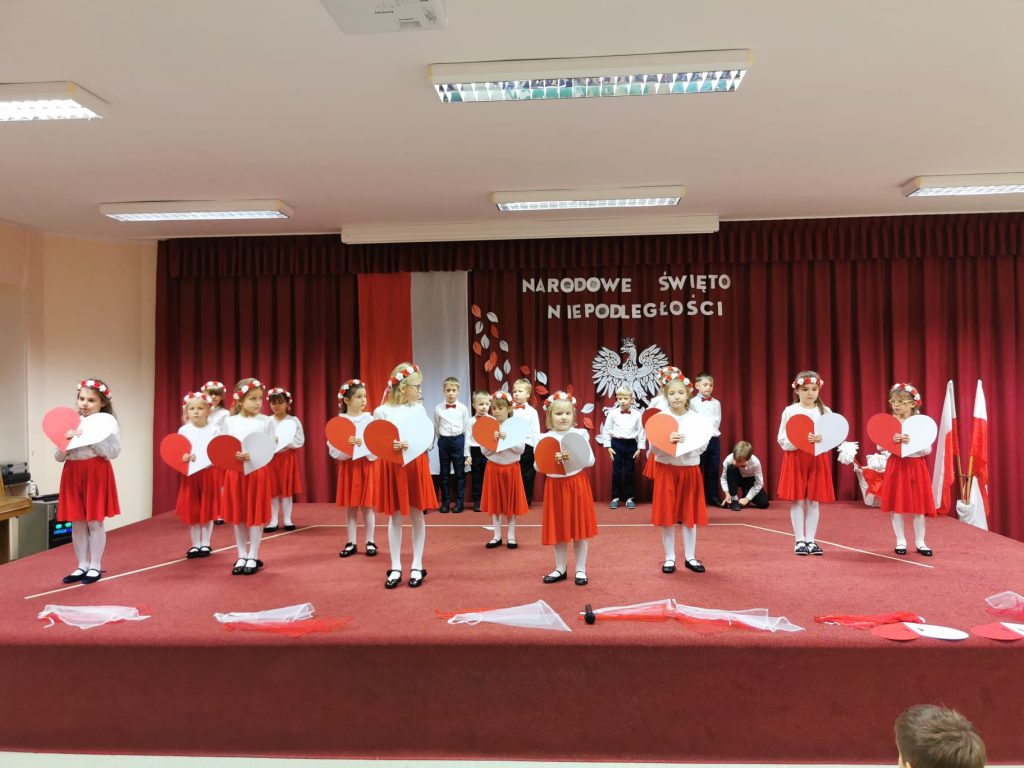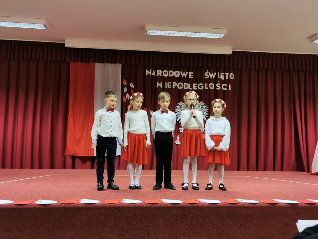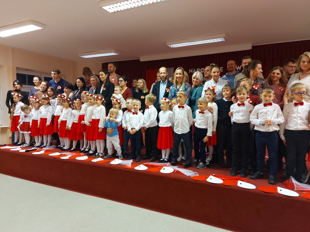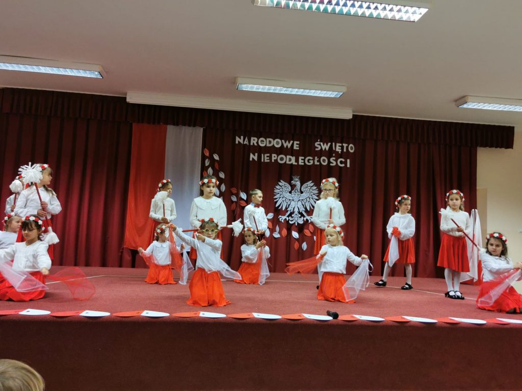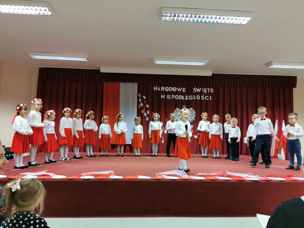 Dnia 13 Listopada w grupie pomarańczowej w ramach obchodów Święta Niepodległości odbyły się warsztaty dla dzieci oraz ich rodziców i rodzin. Na początku dzieci, ubrane w eleganckie stroje, przywitały swoich bliskich na warsztatach patriotycznych. Podczas nich rodzice przygotowali ozdobne kotyliony w barwach narodowych. Następnie wszyscy udali się na aulę, aby zobaczyć część artystyczną przygotowaną przez dzieci z naszej grupy. Podczas występu rodzice mieli okazję obejrzeć tańce i wysłuchać piosenek w wykonaniu dzieci. Całość spotkania zakończyło się wspólnym odśpiewaniem hymnu oraz zrobieniem pamiątkowych zdjęć.