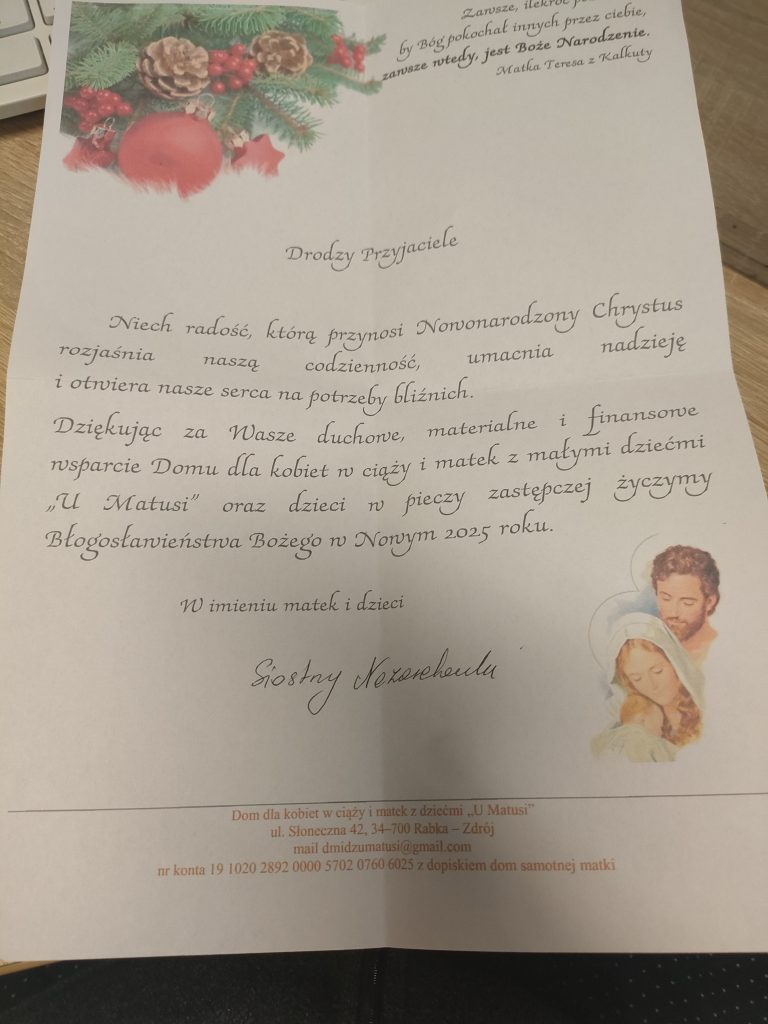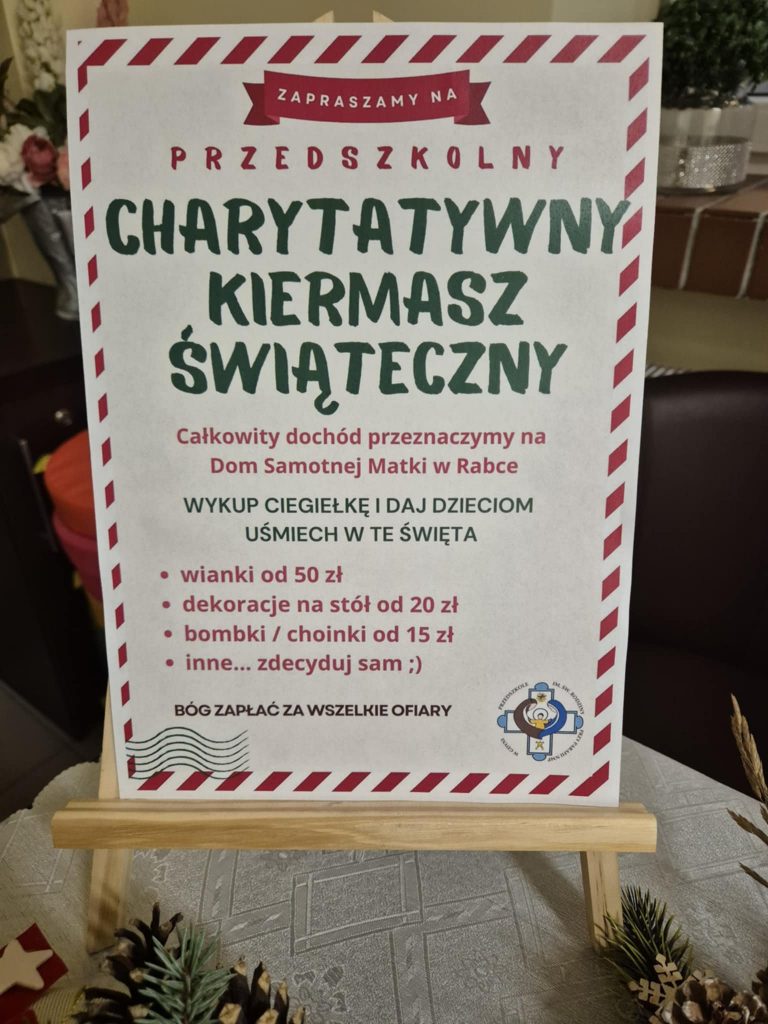 Na początku grudnia w naszym przedszkolu odbyły się warsztaty podczas których rodzice z dziećmi wykonywali ozdoby świąteczne. Następnie ozdoby były sprzedawane podczas kiermaszu Bożonarodzeniowego, a cały dochód ze sprzedaży został przekazany na potrzeby Domu dla kobiet w ciąży i matek z dziećmi „U Matusi” w Rabce. Bardzo dziękujemy wszystkim, którzy wsparli wydarzenie. Słowo podziękowania wraz z życzeniami skierowały do nas Siostry Nazaretanki prowadzące dzieło oraz mamy z dziećmi. Więcej o działalności Domu dla kobiet w ciąży i matek z dziećmi „U Matusi” można poczytać tutaj: https://przystanwnazarecie.pl/ i na FB: www.facebook.com/p/Dom-Matki-i-Dziecka-U-Matusi-w-Rabce-Zdroju-100082592764740/