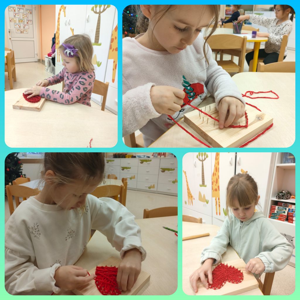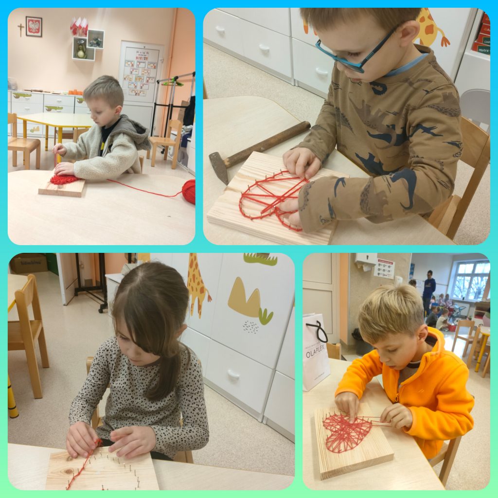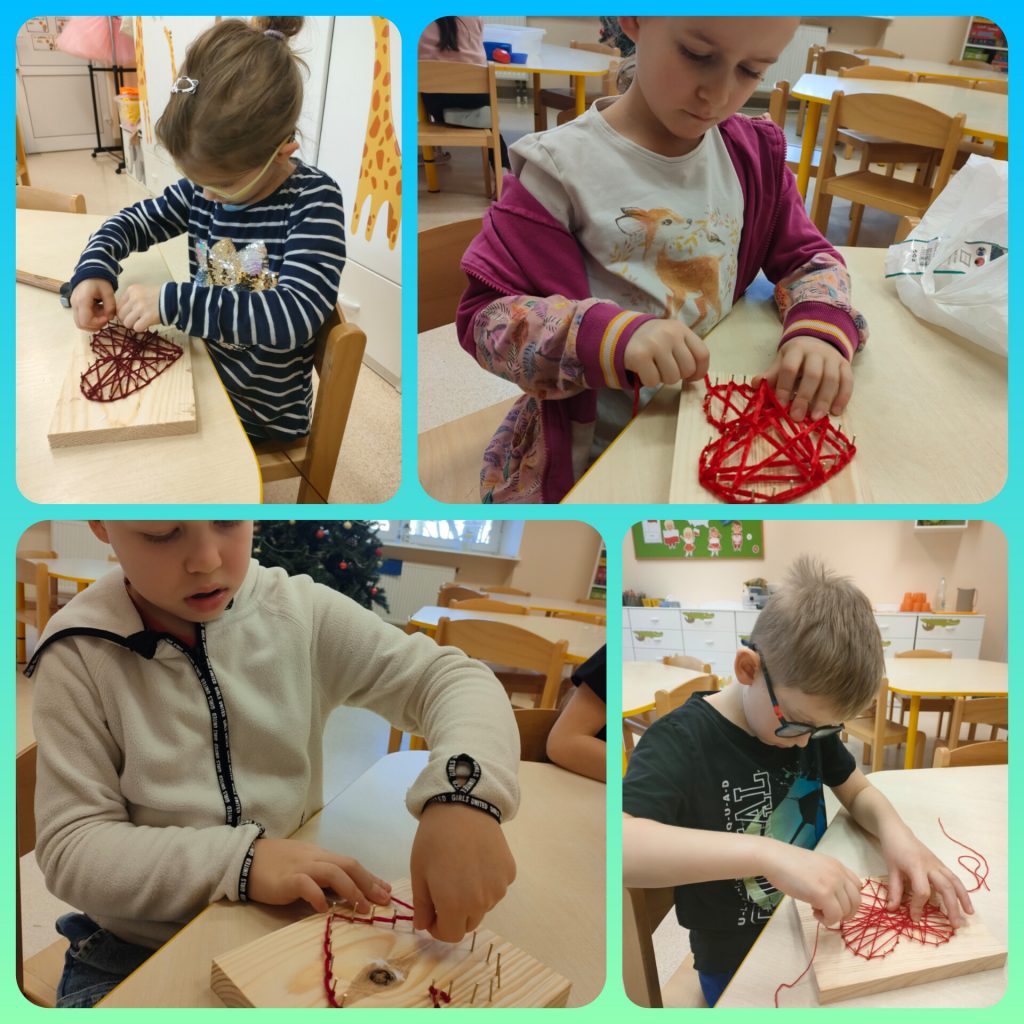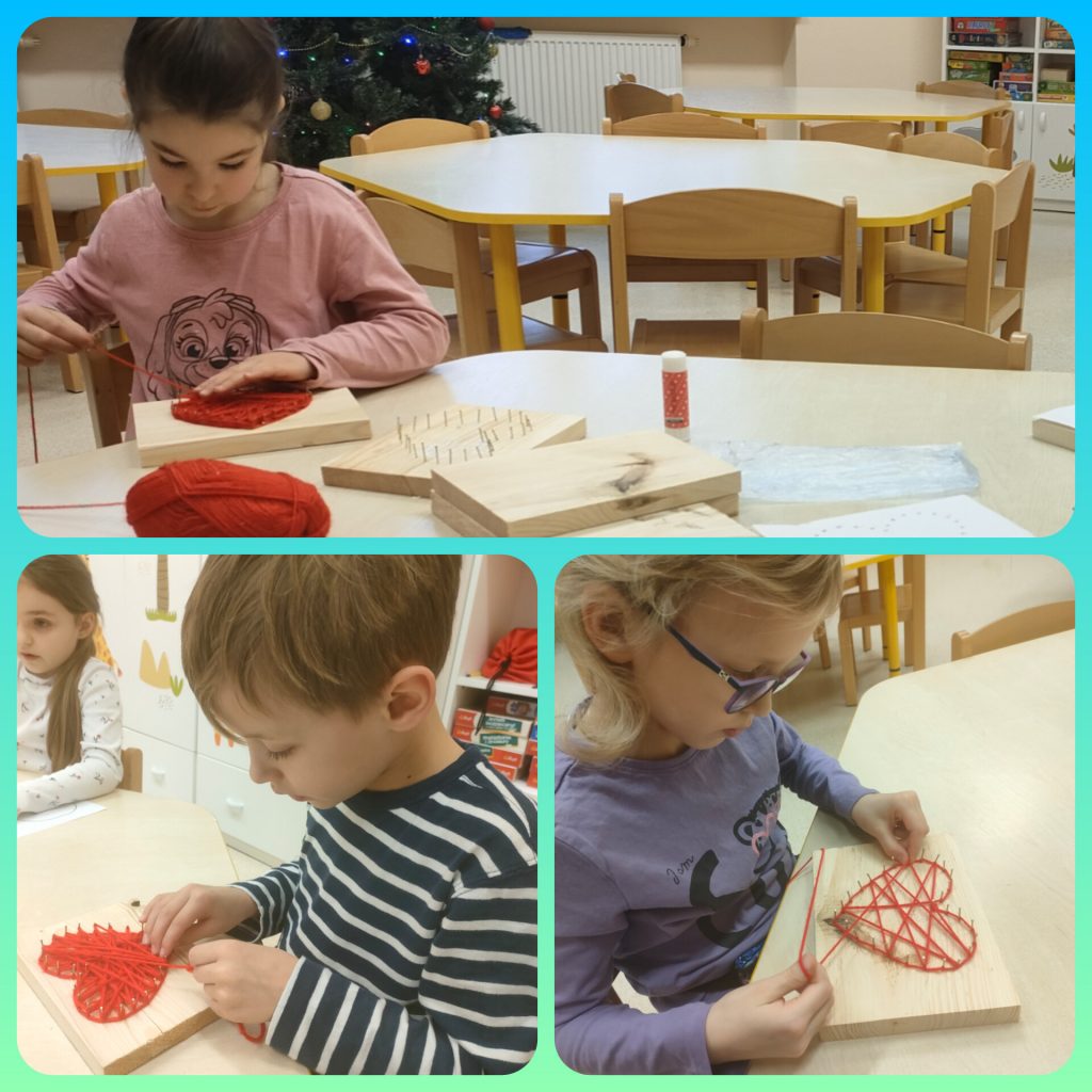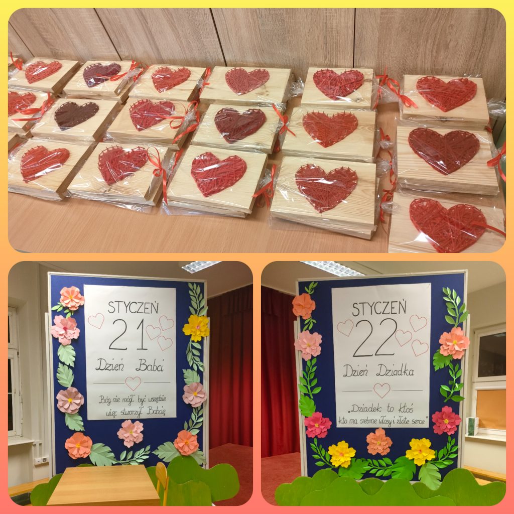 Z okazji Dnia Babci i Dziadka dzieci z grupy pomarańczowej przygotowały krótkie przedstawienie o tym jak Babcia i Dziadek są czarodziejami. Były wierszyki, tańce i piosenki. Na koniec przedstawienia dzieci wręczyły dziadkom serduszka wykonane metodą String Art, które samodzielnie wykonały od początku do końca. Trochę musiały się napracować, bo najpierw trzeba było przybić gwoździe, a następnie owinąć włóczką. Praca nie łatwa, ale naszym zerówkowiczom świetnie się udało. Cieszymy się z obecności dziadków i babć w naszym przedszkolu 😉